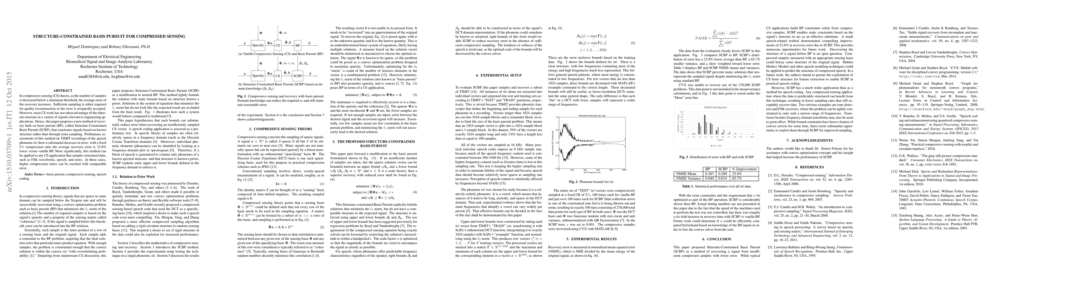 This paper introduces Structure-Constrained Basis Pursuit (SCBP) for compressed sensing, which leverages inherent signal structure instead of extra sampling to improve recovery accuracy. Preliminary results show a 23.8% reduction in error compared to standard basis pursuit, with potential for higher compression ratios in structured data applications.