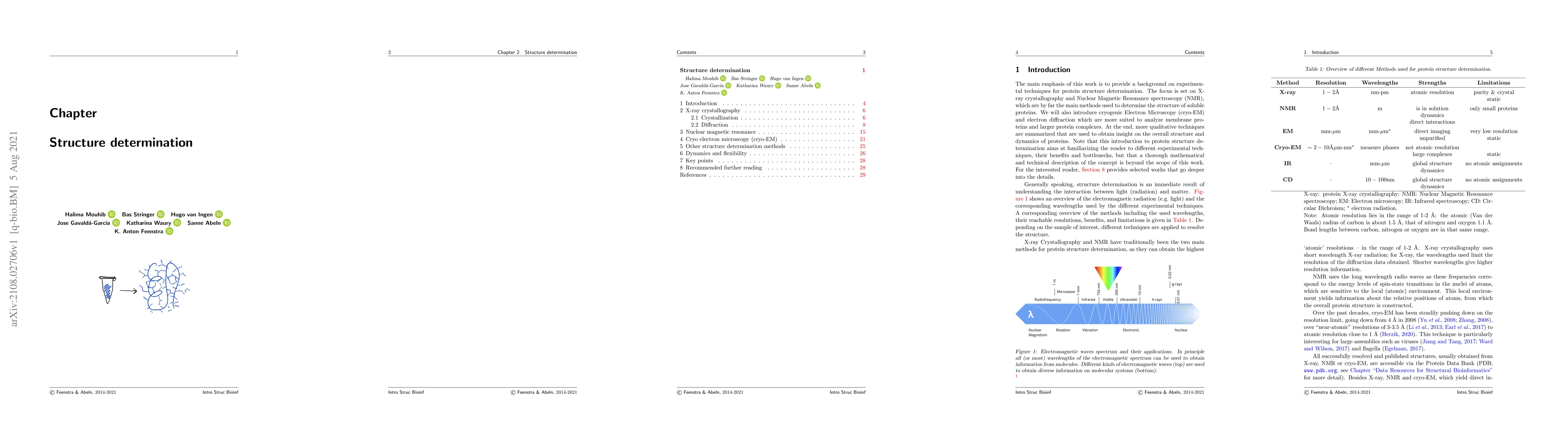 While many good textbooks are available on Protein Structure, Molecular Simulations, Thermodynamics and Bioinformatics methods in general, there is no good introductory level book for the field of Structural Bioinformatics. This book aims to give an introduction into Structural Bioinformatics, which is where the previous topics meet to explore three dimensional protein structures through computational analysis. We provide an overview of existing computational techniques, to validate, simulate, predict and analyse protein structures. More importantly, it will aim to provide practical knowledge about how and when to use such techniques. We will consider proteins from three major vantage points: Protein structure quantification, Protein structure prediction, and Protein simulation & dynamics. The main emphasis of this work is to provide a background on experimental techniques for protein structure determination. The focus is set on X-ray crystallography and Nuclear Magnetic Resonance spectroscopy (NMR), which are by far the main methods used to determine the structure of soluble proteins. We will also introduce cryogenic Electron Microscopy (cryo-EM) and electron diffraction which are more suited to analyze membrane proteins and larger protein complexes. At the end, more qualitative techniques are summarized that are used to obtain insight on the overall structure and dynamics of proteins. Note that this introduction to protein structure determination aims at familiarizing the reader to different experimental techniques, their benefits and bottlenecks, but that a thorough mathematical and technical description of the concept is beyond the scope of this work.