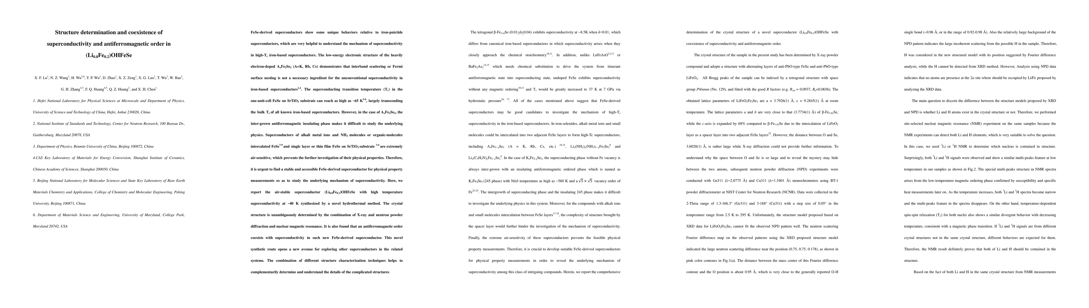 Researchers discovered a new air-stable superconductor, (Li0.8Fe0.2)OHFeSe, with high-temperature superconductivity at ~40 K, coexisting with antiferromagnetic order in iron-based superconductors.