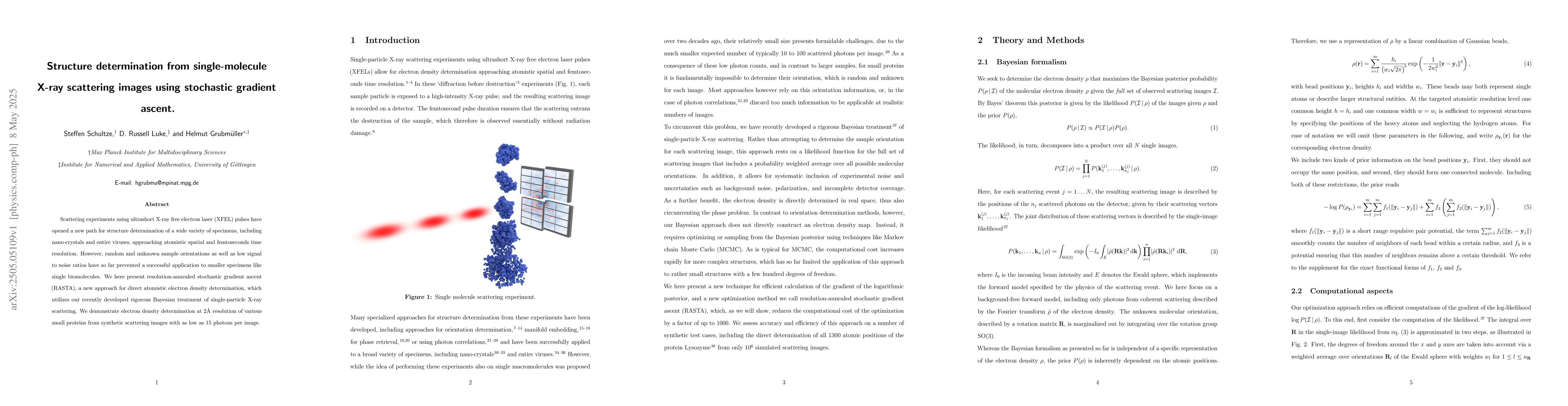 Scattering experiments using ultrashort X-ray free electron laser (XFEL) pulses have opened a new path for structure determination of a wide variety of specimens, including nano-crystals and entire viruses, approaching atomistic spatial and femtoseconds time resolution. However, random and unknown sample orientations as well as low signal to noise ratios have so far prevented a successful application to smaller specimens like single biomolecules. We here present resolution-annealed stochastic gradient ascent (RASTA), a new approach for direct atomistic electron density determination, which utilizes our recently developed rigorous Bayesian treatment of single-particle X-ray scattering. We demonstrate electron density determination at 2\r{A} resolution of various small proteins from synthetic scattering images with as low as 15 photons per image.