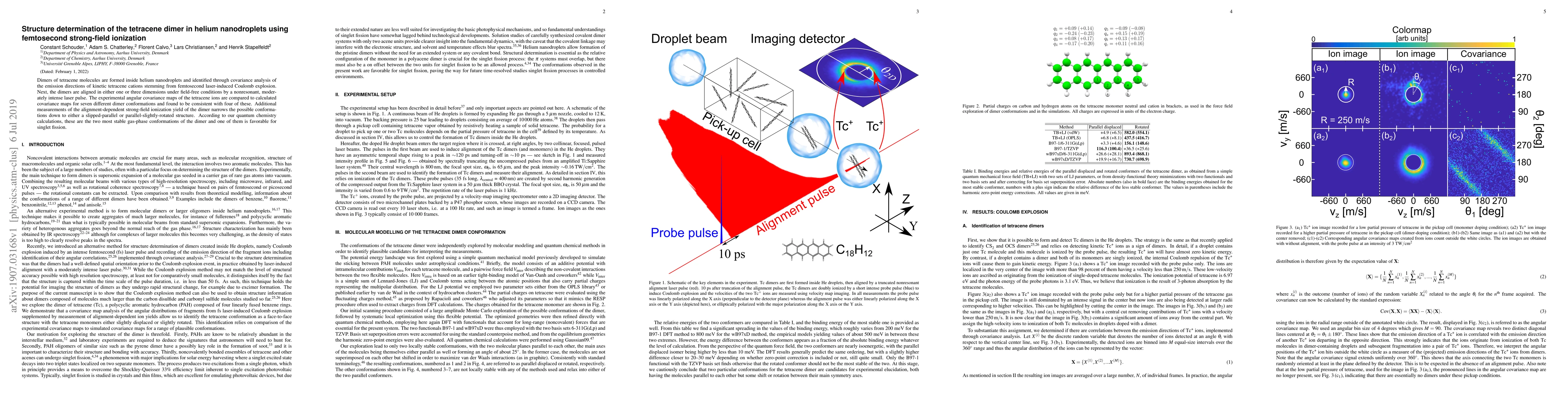 This research determines the structure of tetracene dimers in helium nanodroplets using femtosecond laser-induced Coulomb explosion and strong-field ionization. The study identifies the most stable conformations through experimental and quantum chemistry analysis, concluding that the dimers likely adopt either a slipped-parallel or parallel-slightly-rotated structure.