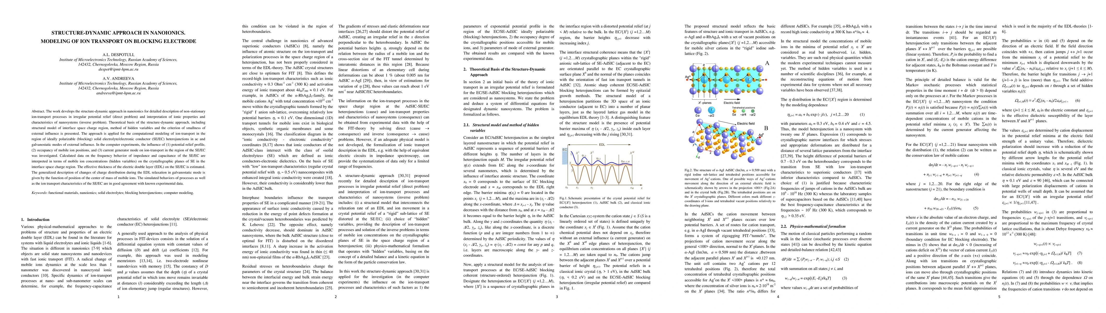 This paper introduces a structure-dynamic approach to model non-stationary ion transport in nanoionics, focusing on irregular potential reliefs and inverse problem interpretation. The approach is applied to simulate ion transport at blocking solid electrolyte/electronic conductor heterojunctions under ac and galvanostatic conditions.