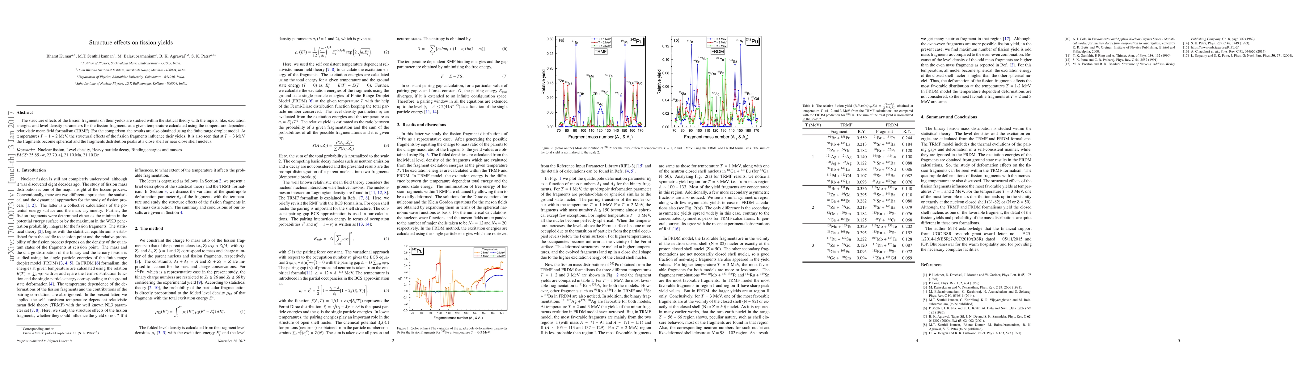 The structure effects of the fission fragments on their yields are studied within the statical theory with the inputs, like, excitation energies and level density parameters for the fission fragments at a given temperature calculated using the temperature dependent relativistic mean field formalism (TRMF). For the comparison, the results are also obtained using the finite range droplet model. At temperatures $T =1-2$ MeV, the structural effects of the fission fragments influence their yields. It is also seen that at $T = $ 3 MeV, the fragments become spherical and the fragments distribution peaks at a close shell or near close shell nucleus.