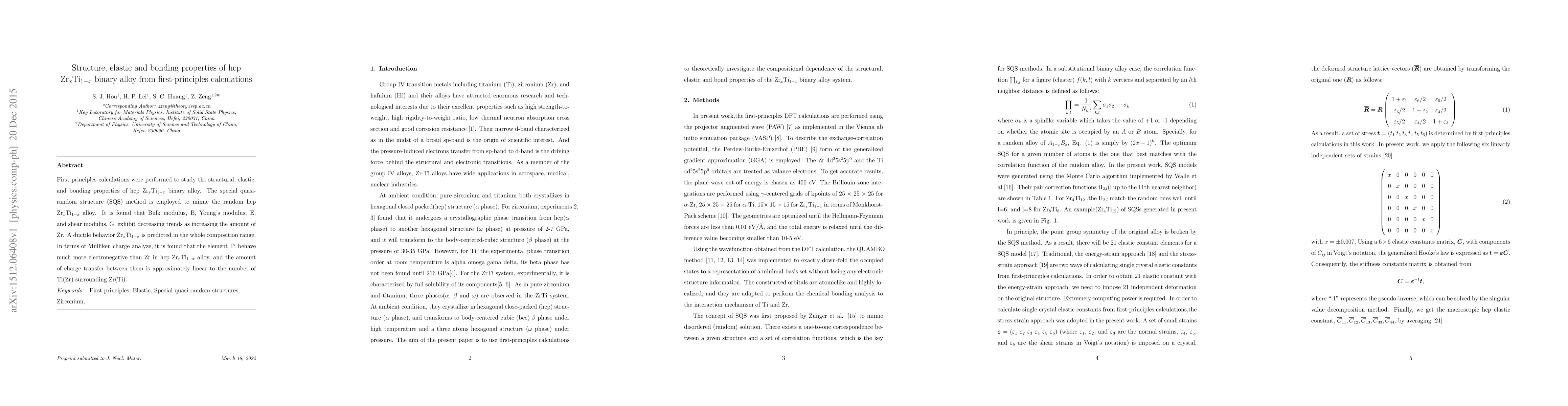 First-principles calculations reveal that the hcp ZrxTi1-x binary alloy exhibits decreasing bulk, Young's, and shear moduli with increasing Zr content, predicting ductile behavior across all compositions. The Mulliken charge analysis indicates Ti is more electronegative than Zr, with charge transfer proportional to the surrounding element composition.
