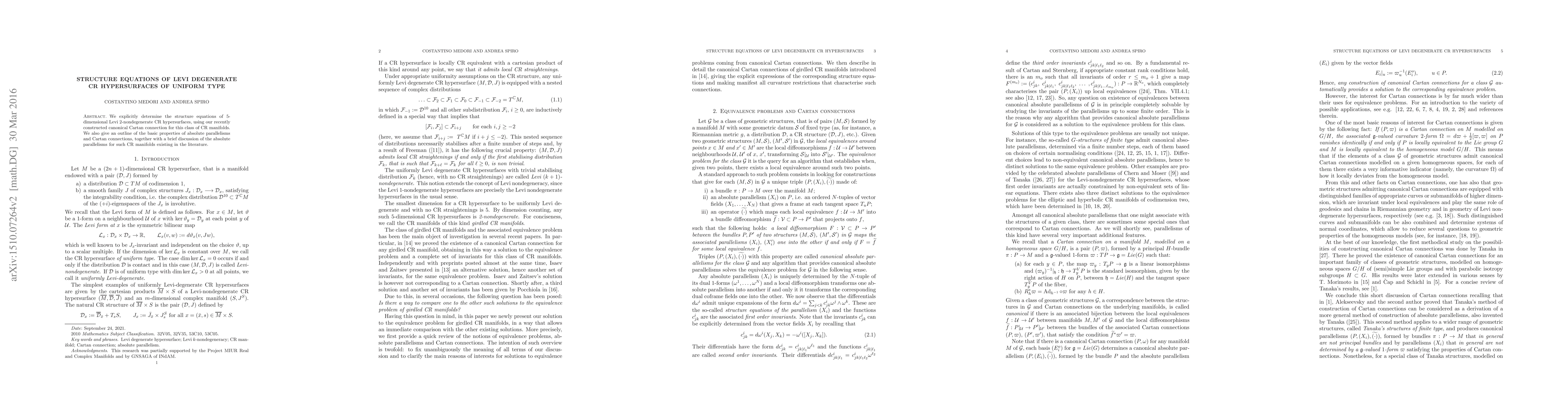 Researchers have developed a new framework for analyzing Levi degenerate CR hypersurfaces of uniform type, providing explicit structure equations and exploring properties of absolute parallelisms and Cartan connections.