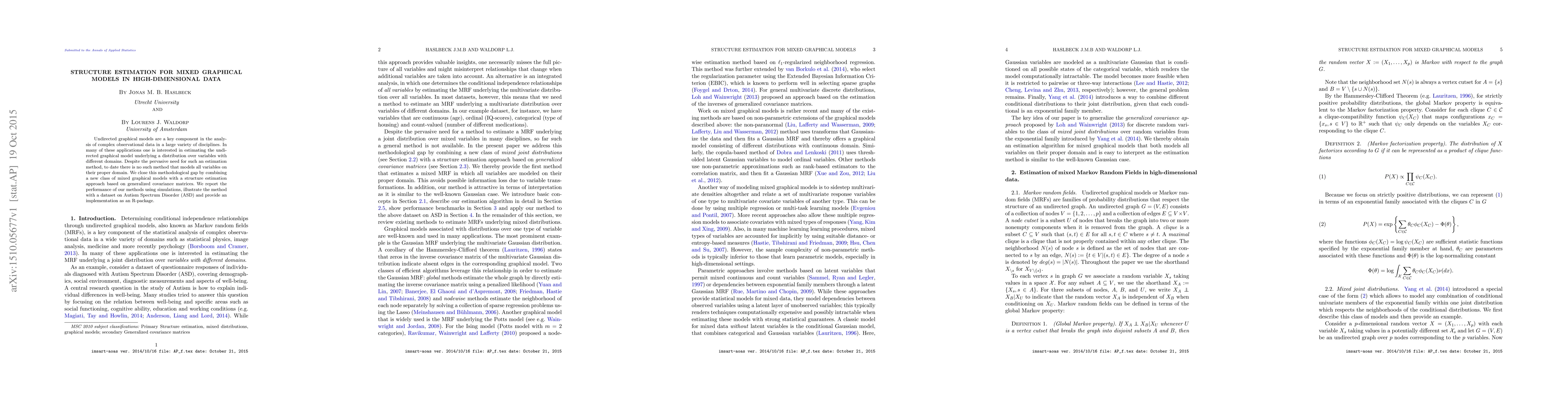 This paper introduces a new method for estimating the structure of mixed graphical models in high-dimensional data, addressing the lack of existing methods that accommodate different variable domains. The proposed approach uses generalized covariance matrices and is demonstrated through simulations and an application to Autism Spectrum Disorder data, with an accompanying R-package.