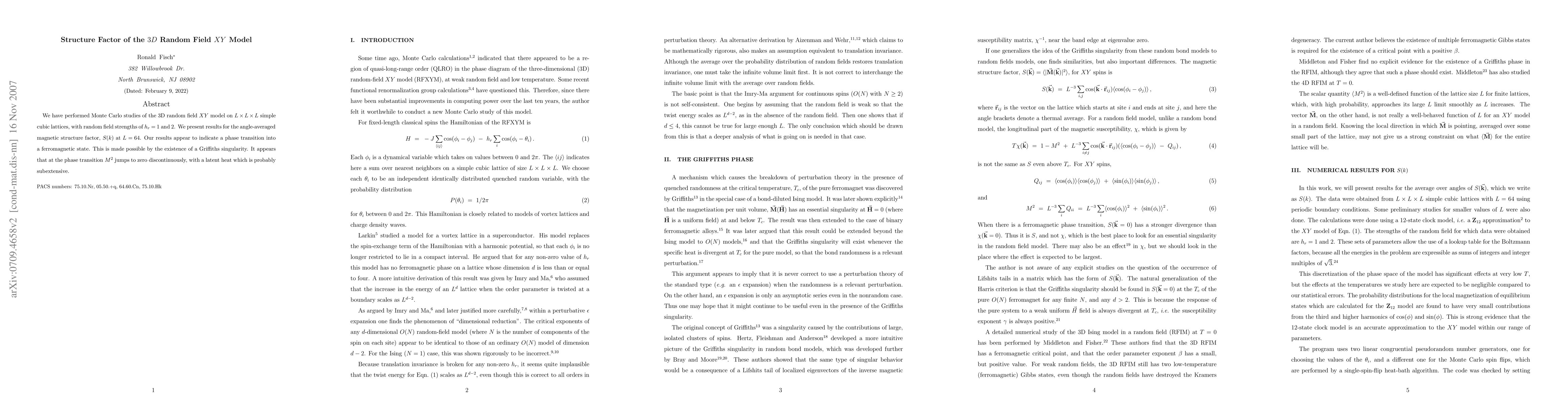 We have performed Monte Carlo studies of the 3D random field XY model on $L \times L \times L$ simple cubic lattices, with random field strengths of $h_r$ = 1 and 2. We present results for the angle-averaged magnetic structure factor, $S (k)$ at $L = 64$. Our results appear to indicate a phase transition into a ferromagnetic state. This is made possible by the existence of a Griffiths singularity. It appears that at the phase transition $M^2$ jumps to zero discontinuously, with a latent heat which is probably subextensive.