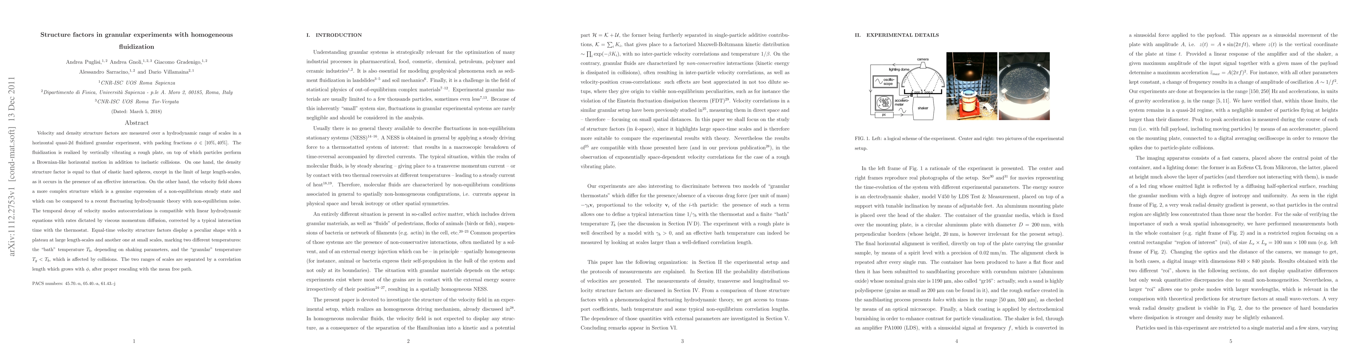 Researchers studied granular experiments with homogeneous fluidization, finding that density structure factors resemble those of elastic hard spheres, but velocity fields show a complex non-equilibrium structure. The study provides insights into the behavior of grains in fluidized conditions.