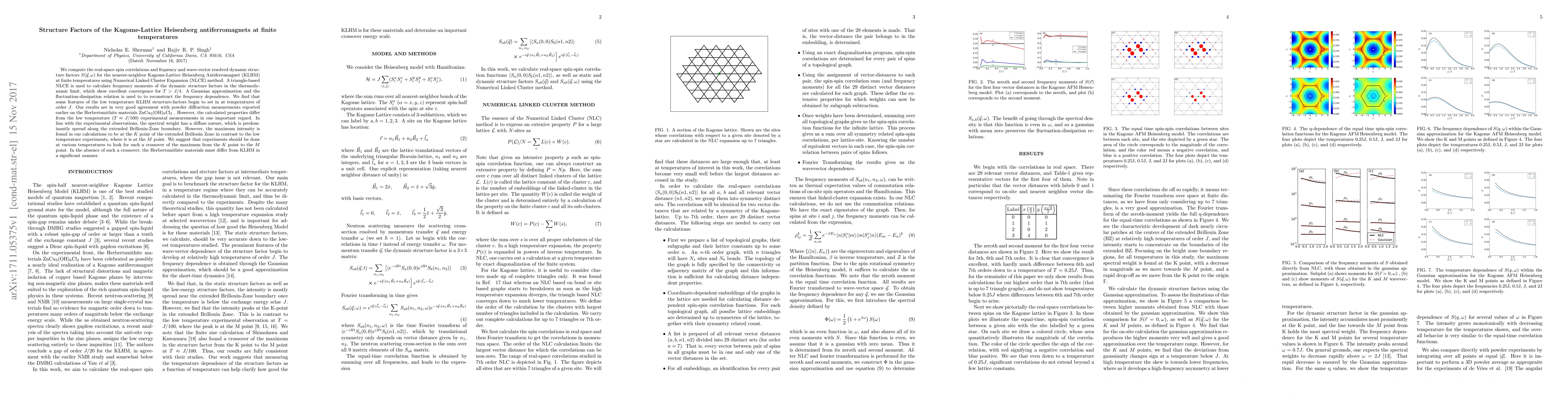 We compute the real-space spin correlations and frquency and wave-vector resolved dynamic structure factors $S(\vec q,\omega)$ for the nearest-neighbor Kagome-Lattice Heisenberg Antiferromagnet (KLHM) at finite temperatures using Numerical Linked Cluster Expansion (NLCE) method. A triangle-based NLCE is used to calculate frequency moments of the dynamic structure factors in the thermodynamic limit, which show excellent convergence for $T> J/4$. A Gaussian approximation and the fluctuation-dissipation relation are used to to reconstruct the frequency dependence. We find that some features of the low temperature KLHM structure-factors begin to set in at temperatures of order $J$. Our results are in very good agreement with powder diffraction measurements reported earlier on the Herbertsmithite materials ZnCu$_3$(OH)$_6$Cl$_2$. However, the calculated properties differ from the low temperature ($T\approx J/100$) experimental measurements in one important regard. In line with the experimental observations, the spectral weight has a diffuse nature, which is predominantly spread along the extended Brillouin-Zone boundary. However, the maximum intensity is found in our calculations to be at the $K$ point of the extended Brillouin Zone in contrast to the low temperature experiments, where it is at the $M$ point. We suggest that experiments should be done at various temperatures to look for such a crossover of the maximum from the $K$ point to the $M$ point. In the absence of such a crossover, the Herbertsmithite materials must differ from KLHM in a significant manner.