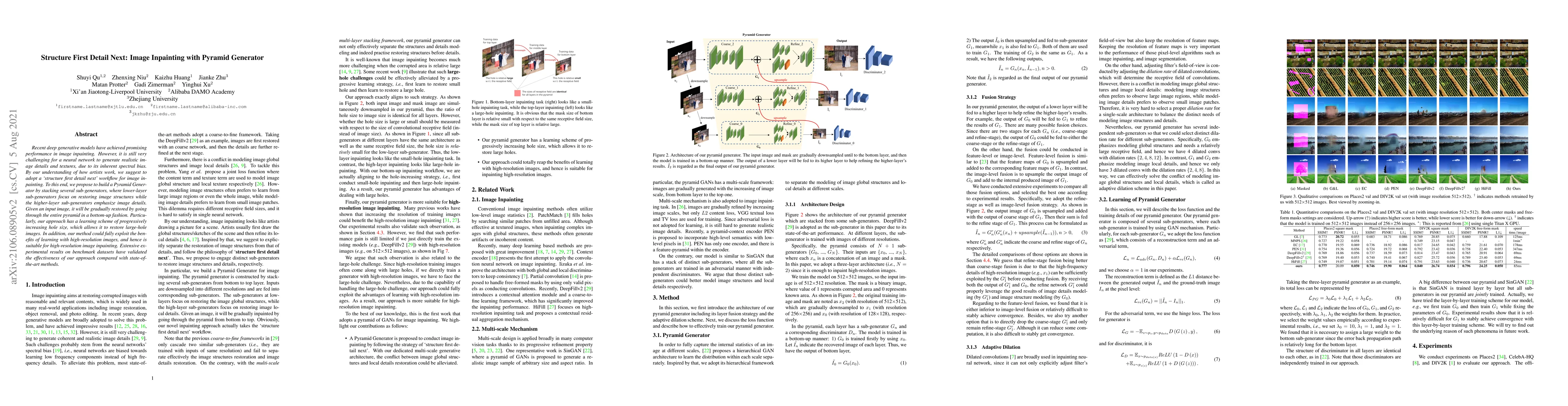 This paper proposes a Pyramid Generator for image inpainting that follows a "structure first, detail next" workflow, inspired by artistic techniques. The method uses a multi-layered sub-generator structure, with lower layers focusing on image structures and higher layers on details, progressively restoring the image from large to small holes.