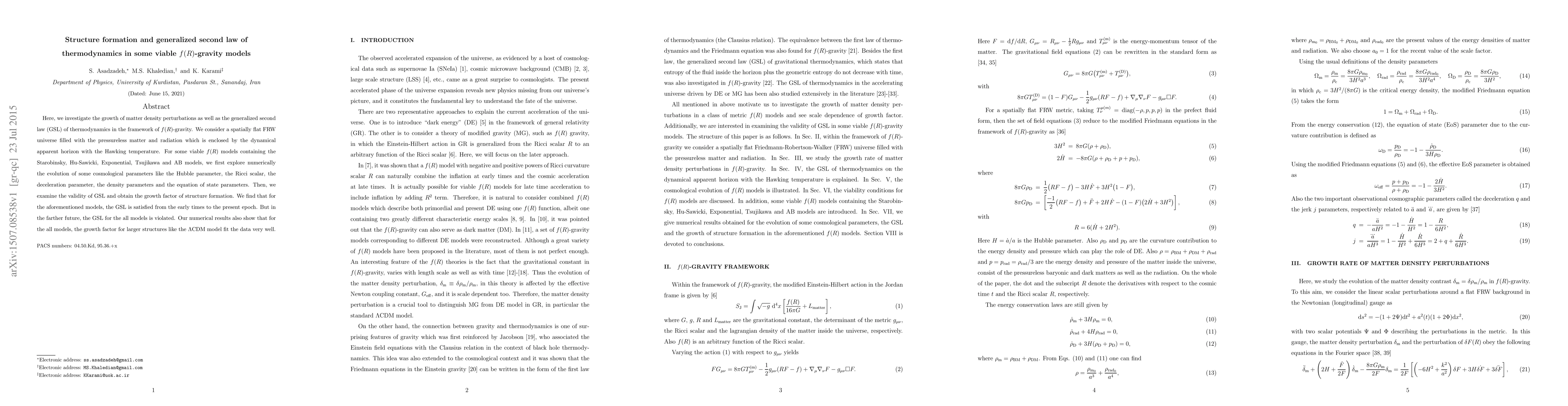 This paper explores the evolution of matter density perturbations and the generalized second law of thermodynamics in various $f(R)$-gravity models, finding that the GSL holds from early times to the present but is violated in the future, while the growth factor for larger structures aligns well with $\Lambda$CDM model data.