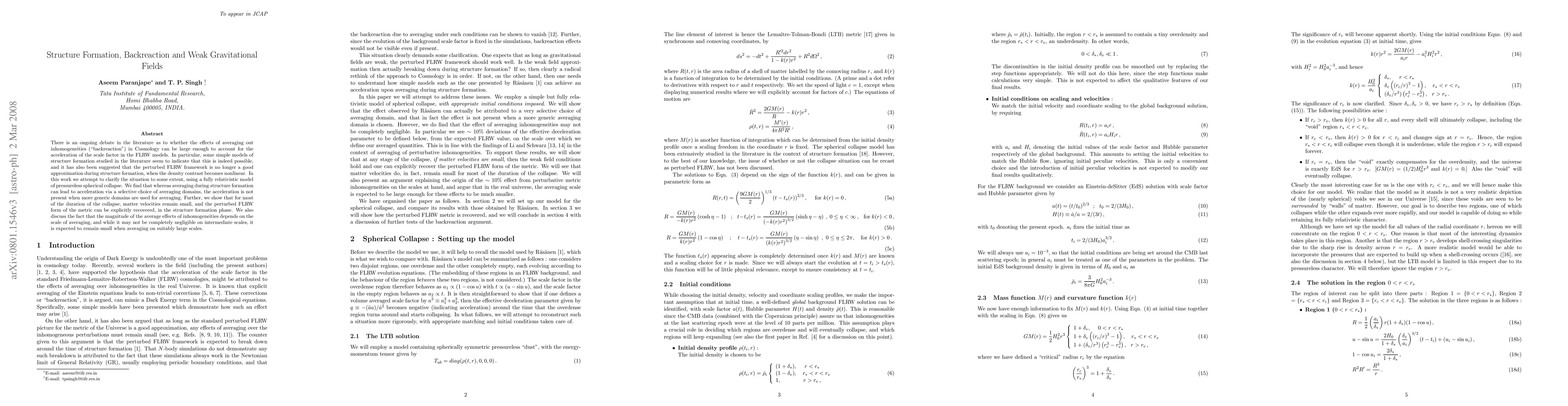 This paper investigates the impact of cosmic structure formation on the universe's expansion, using a relativistic spherical collapse model. It finds that averaging inhomogeneities can cause acceleration with specific domain choices, but not universally. The study reveals that matter velocities remain small during collapse, and the perturbed FLRW metric can be recovered. The effect's magnitude depends on the averaging scale, being negligible on large scales.