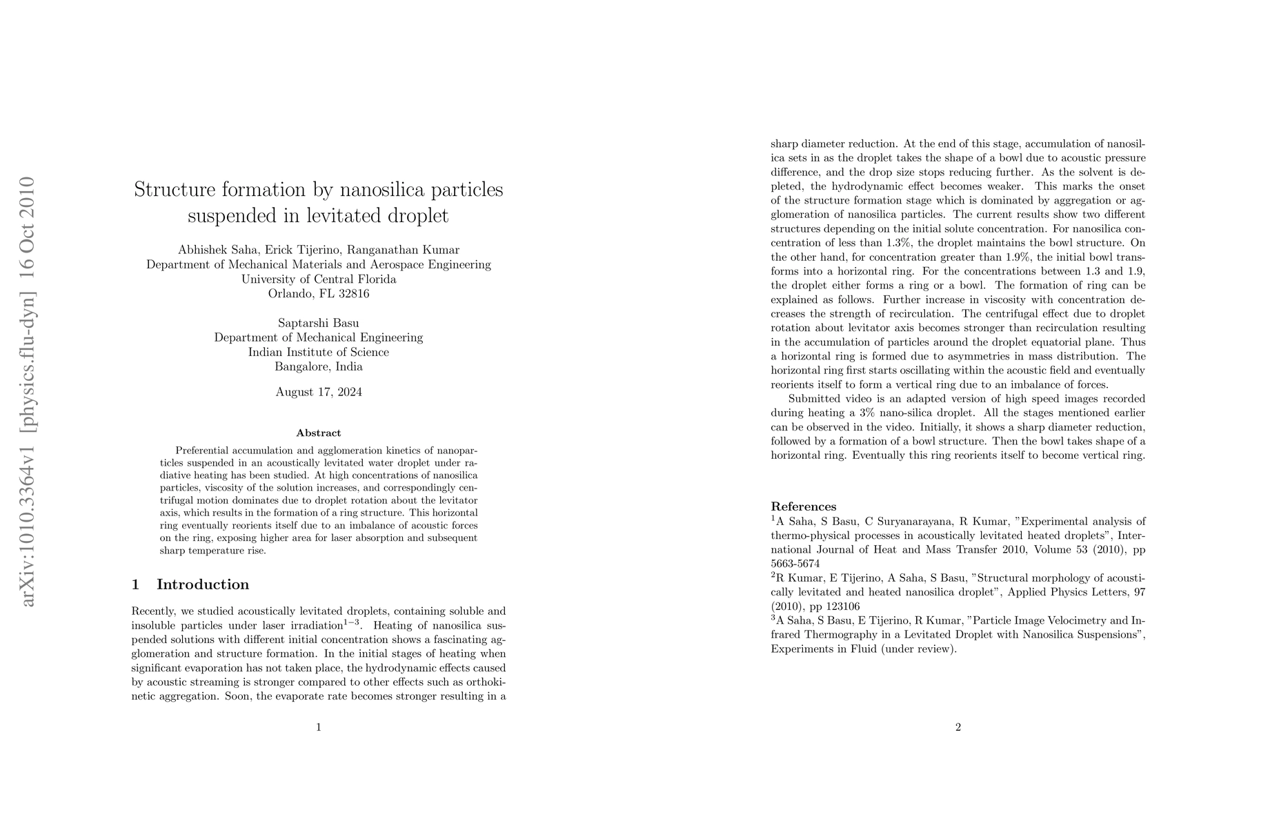 This study investigates the behavior of nanosilica particles in levitated droplets under laser irradiation, revealing solute migration patterns and recirculation flows. Higher nanosilica concentrations lead to the formation of vertical ring structures due to stronger centrifugal forces overcoming recirculation.
