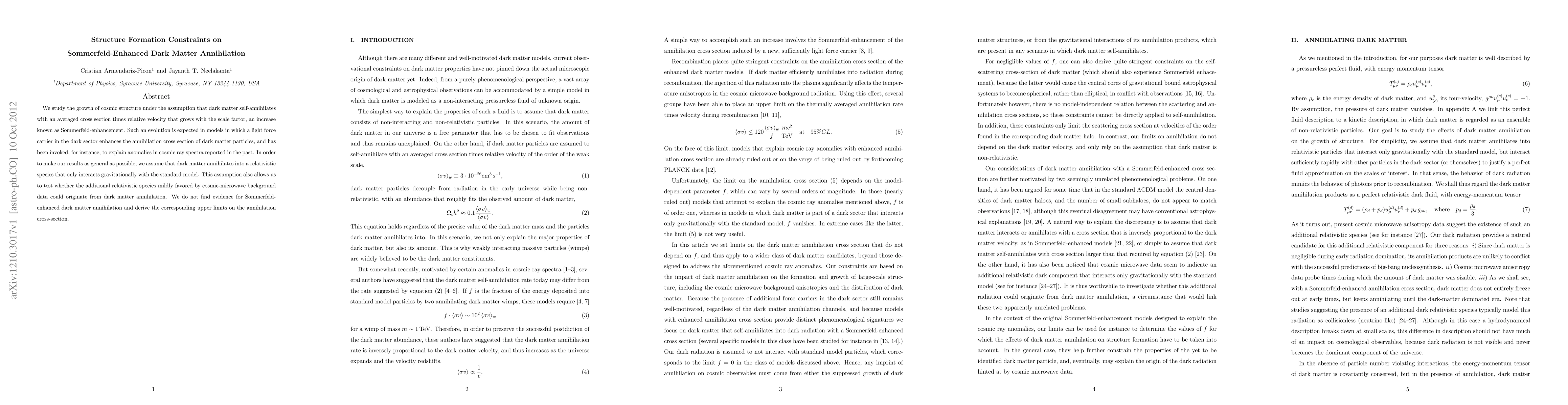This paper investigates the impact of Sommerfeld-enhanced dark matter annihilation on cosmic structure formation, finding no evidence for such enhancement and establishing upper limits on the annihilation cross-section. The study assumes dark matter annihilates into a relativistic species with only gravitational interactions.