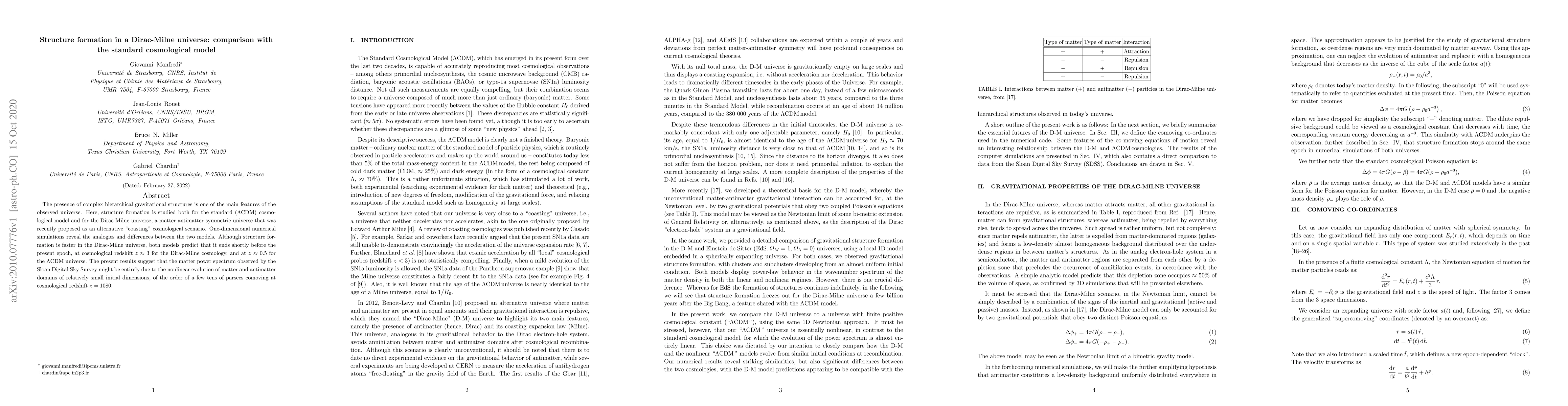 The presence of complex hierarchical gravitational structures is one of the main features of the observed universe. Here, structure formation is studied both for the standard ($\Lambda \rm CDM$) cosmological model and for the Dirac-Milne universe, a matter-antimatter symmetric universe that was {\gm recently} proposed as an alternative "coasting" cosmological scenario. One-dimensional numerical simulations reveal the analogies and differences between the two models. Although structure formation is faster in the Dirac-Milne universe, both models predict that it ends shortly before the present epoch, at cosmological redshift $z \approx 3$ for the Dirac-Milne cosmology, and at $z \approx 0.5$ for the $\Lambda \rm CDM$ universe. The present results suggest that the matter power spectrum observed by the Sloan Digital Sky Survey might be entirely due to the nonlinear evolution of matter and antimatter domains of relatively small initial dimensions, of the order of a few tens of parsecs comoving at cosmological redshift $z =1080$.