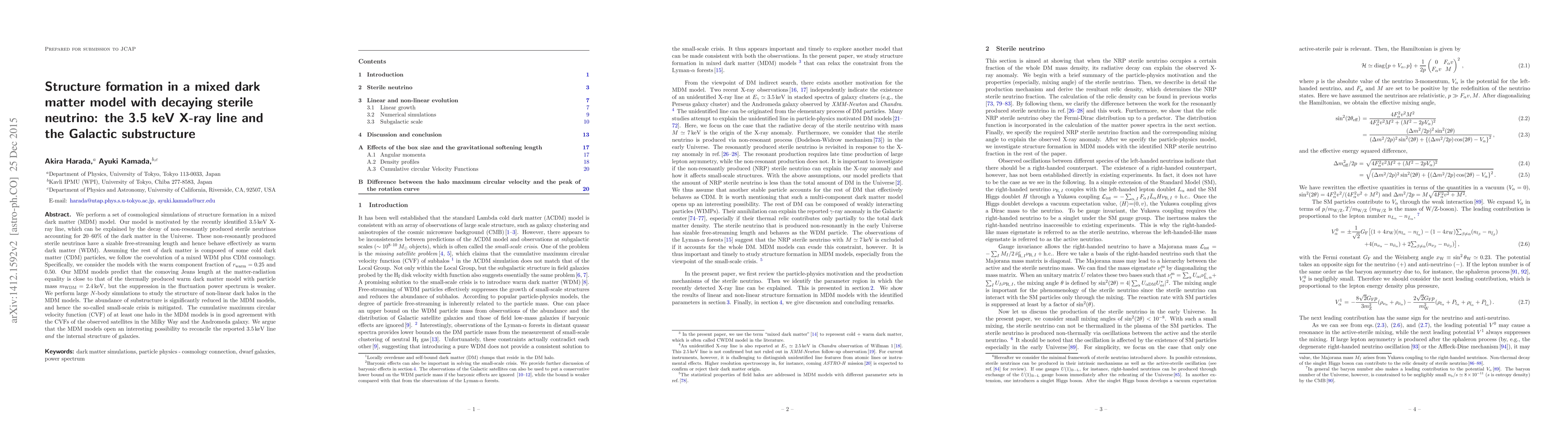 We perform a set of cosmological simulations of structure formation in a mixed dark matter (MDM) model. Our model is motivated by the recently identified $3.5\,{\rm keV}$ X-ray line, which can be explained by the decay of non-resonantly produced sterile neutrinos accounting for $20$-$60\%$ of the dark matter in the Universe. These non-resonantly produced sterile neutrinos have a sizable free-streaming length and hence behave effectively as warm dark matter (WDM). Assuming the rest of dark matter is composed of some cold dark matter (CDM) particles, we follow the coevolution of a mixed WDM plus CDM cosmology. Specifically, we consider the models with the warm component fraction of $r_{\rm warm}=0.25$ and $0.50$. Our MDM models predict that the comoving Jeans length at the matter-radiation equality is close to that of the thermally produced warm dark matter model with particle mass $m_{\rm WDM}=2.4\,{\rm keV}$, but the suppression in the fluctuation power spectrum is weaker. We perform large $N$-body simulations to study the structure of non-linear dark halos in the MDM models. The abundance of substructure is significantly reduced in the MDM models, and hence the so-called small-scale crisis is mitigated. The cumulative maximum circular velocity function (CVF) of at least one halo in the MDM models is in good agreement with the CVFs of the observed satellites in the Milky Way and the Andromeda galaxy. We argue that the MDM models open an interesting possibility to reconcile the reported $3.5\,{\rm keV}$ line and the internal structure of galaxies.