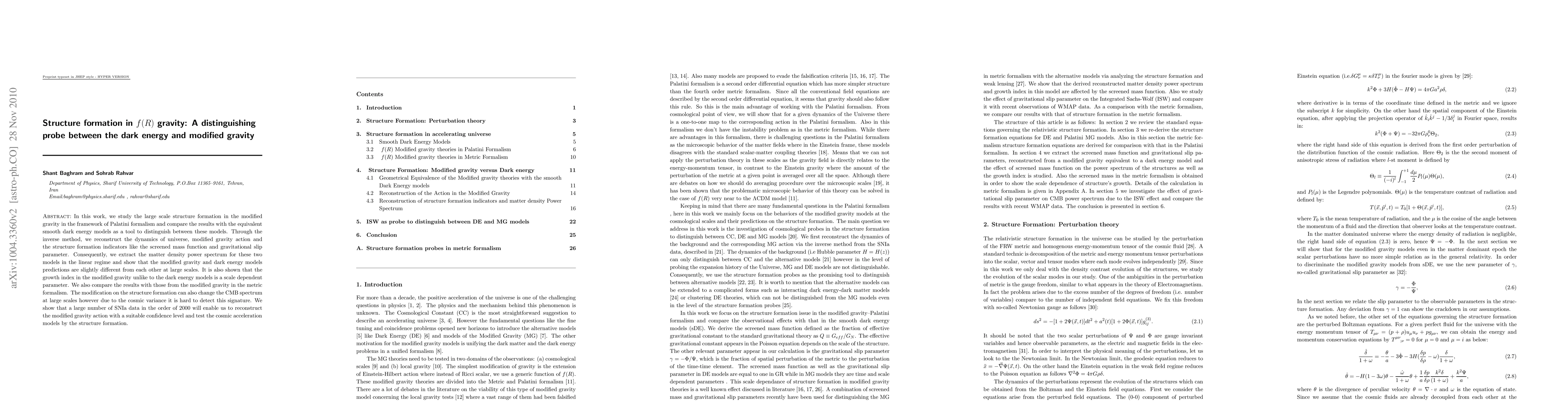 This paper investigates structure formation in $f(R)$ gravity using the Palatini formalism and compares it with smooth dark energy models to differentiate between modified gravity and dark energy. The study finds slight differences in matter density power spectra and shows that the growth index in modified gravity is scale-dependent, potentially detectable with a large number of supernovae data.