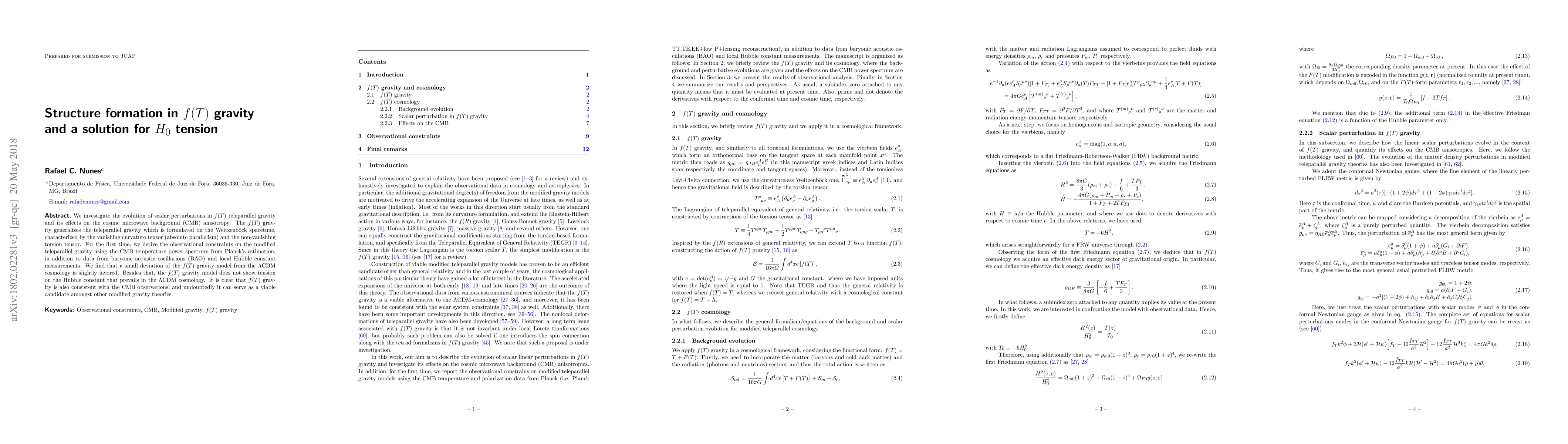 We investigate the evolution of scalar perturbations in $f(T)$ teleparallel gravity and its effects on the cosmic microwave background (CMB) anisotropy. The $f(T)$ gravity generalizes the teleparallel gravity which is formulated on the Weitzenb\"ock spacetime, characterized by the vanishing curvature tensor (absolute parallelism) and the non-vanishing torsion tensor. For the first time, we derive the observational constraints on the modified teleparallel gravity using the CMB temperature power spectrum from Planck's estimation, in addition to data from baryonic acoustic oscillations (BAO) and local Hubble constant measurements. We find that a small deviation of the $f(T)$ gravity model from the $\Lambda$CDM cosmology is slightly favored. Besides that, the $f(T)$ gravity model does not show tension on the Hubble constant that prevails in the $\Lambda$CDM cosmology. It is clear that $f(T)$ gravity is also consistent with the CMB observations, and undoubtedly it can serve as a viable candidate amongst other modified gravity theories.