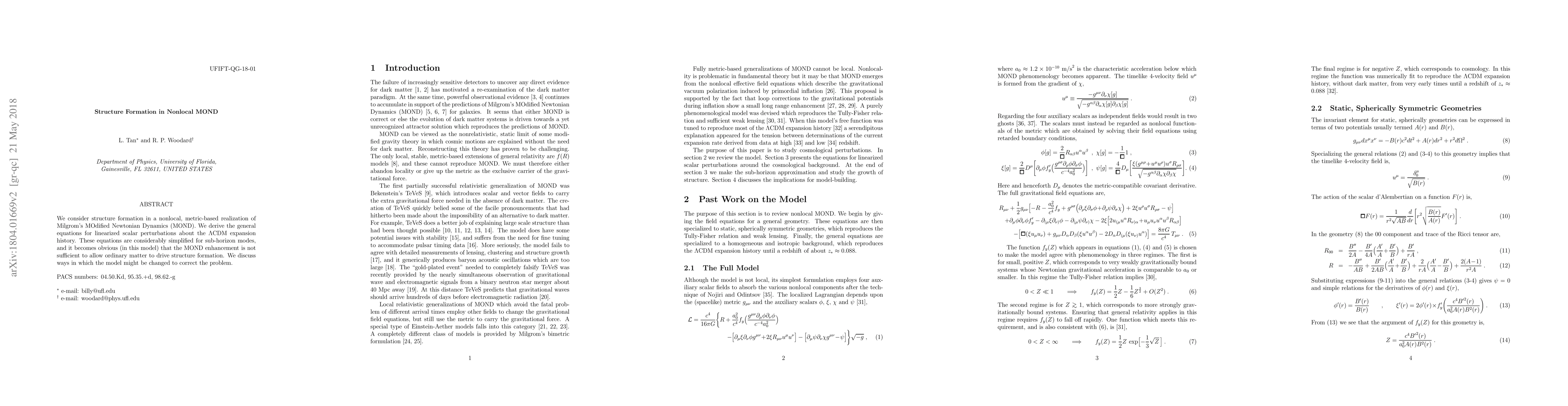 This paper investigates structure formation in a nonlocal MOND model, finding that ordinary matter cannot drive structure without modifications to the theory.