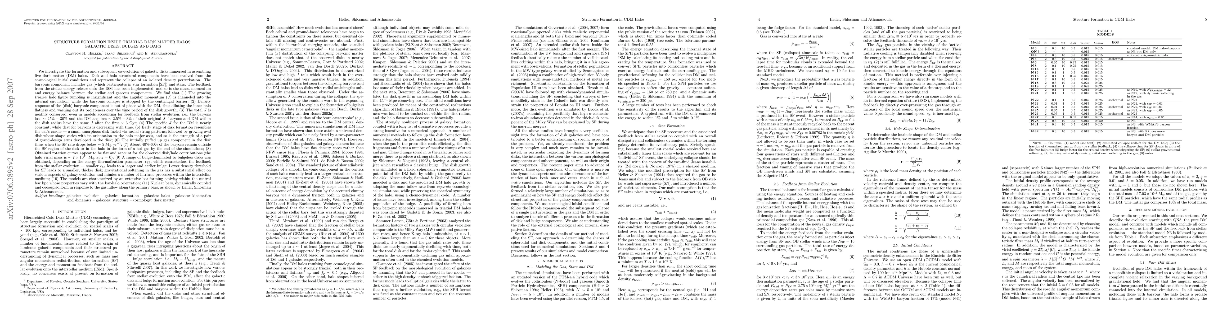 We investigate the formation and evolution of galactic disks immersed in assembling live DM halos. Disk/halo components have been evolved from the cosmological initial conditions and represent the collapse of an isolated density perturbation. The baryons include gas (which participates in star formation [SF]) and stars. The feedback from the stellar energy release onto the ISM has been implemented. We find that (1) The growing triaxial halo figure tumbling is insignificant and the angular momentum (J) is channeled into the internal circulation; (2) Density response of the disk is out of phase with the DM, thus diluting the inner halo flatness and washing out its prolateness; (3) The total J is neathly conserved, even in models accounting for feedback; (4) The specific J for the DM is nearly constant, while that for baryons is decreasing; (5) Early stage of disk formation resembles the cat's cradle -- a small amorphous disk fueled via radial string patterns; (6) The initially puffed up gas component in the disk thins when the SF rate drops below ~5 Mo/yr; (7) About 40%-60% of the baryons remain outside the SF region; (8) Rotation curves appear to be flat and account for the observed disk/halo contributions; (9) A range of bulge-dominated to bulgeless disks was obtained; Lower density threshold for SF leads to a smaller, thicker disk; Gravitational softening in the gas has a substantial effect on various aspects of galaxy evolution and mimics a number of intrinsic processes within the ISM; (10) The models are characterized by an extensive bar-forming activity; (11) Nuclear bars, dynamically coupled and decoupled form in response to the gas inflow along the primary bars.