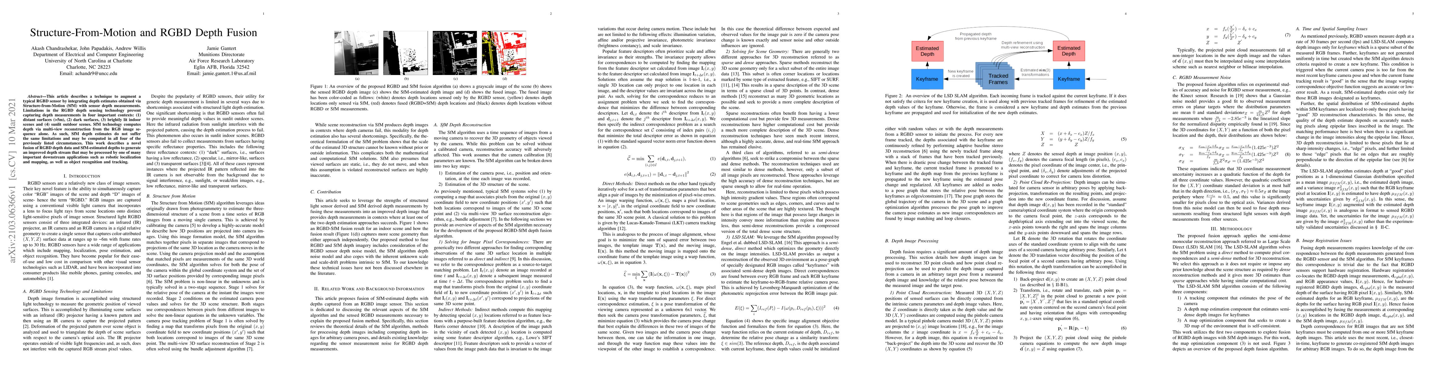This article describes a technique to augment a typical RGBD sensor by integrating depth estimates obtained via Structure-from-Motion (SfM) with sensor depth measurements. Limitations in the RGBD depth sensing technology prevent capturing depth measurements in four important contexts: (1) distant surfaces (>5m), (2) dark surfaces, (3) brightly lit indoor scenes and (4) sunlit outdoor scenes. SfM technology computes depth via multi-view reconstruction from the RGB image sequence alone. As such, SfM depth estimates do not suffer the same limitations and may be computed in all four of the previously listed circumstances. This work describes a novel fusion of RGBD depth data and SfM-estimated depths to generate an improved depth stream that may be processed by one of many important downstream applications such as robotic localization and mapping, as well as object recognition and tracking.