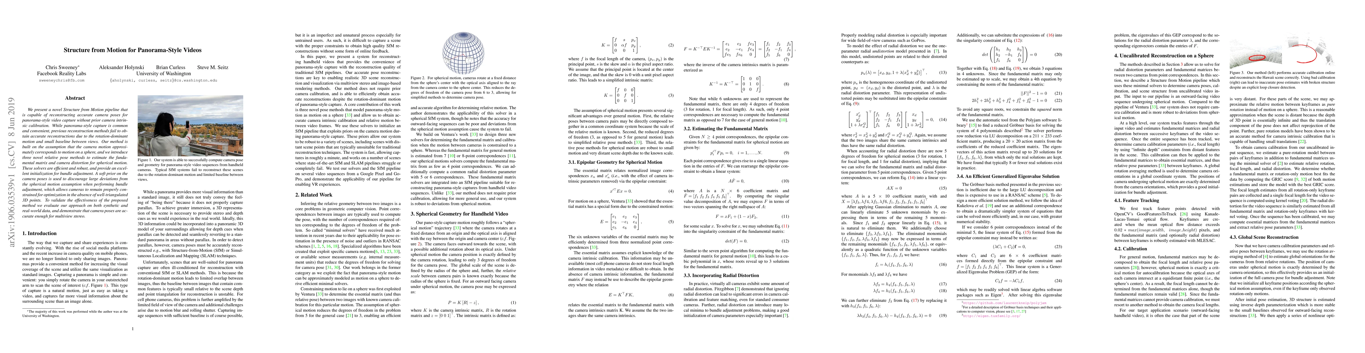 This paper introduces a novel Structure from Motion pipeline for reconstructing accurate camera poses in panorama-style videos without intrinsic calibration. It leverages spherical motion assumptions and three novel relative pose methods, providing robust initialization for bundle adjustment and accurate enough camera poses for multiview stereo.