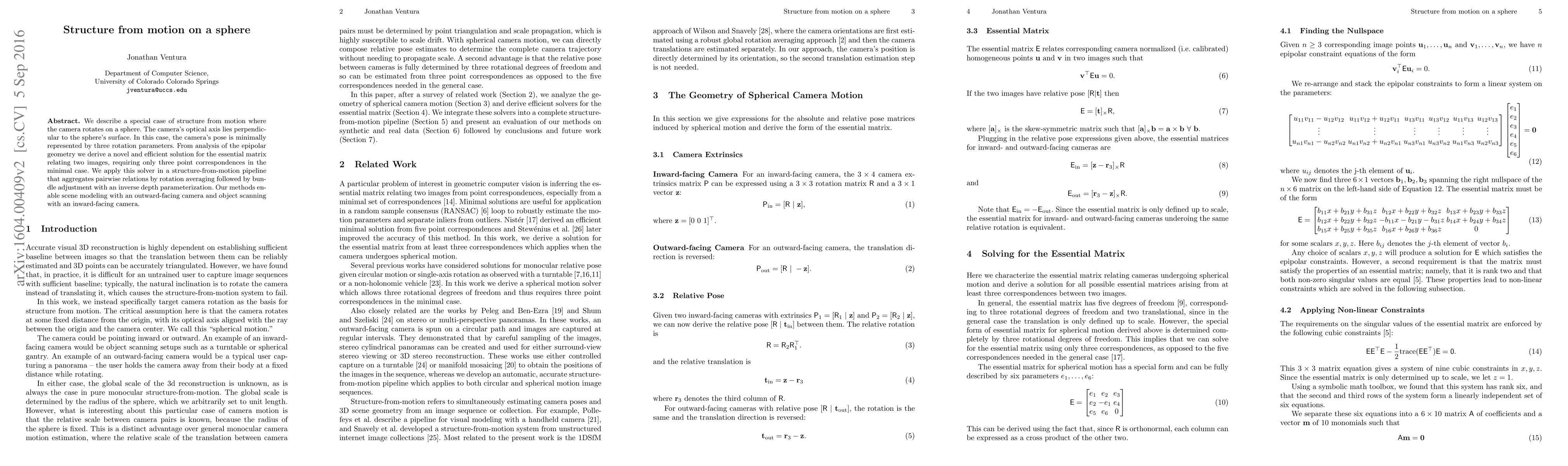 This paper presents a method for deriving the essential matrix from three-point correspondences when a camera rotates on a sphere, enabling efficient structure from motion. The approach uses rotation averaging and bundle adjustment for scene modeling and object scanning.