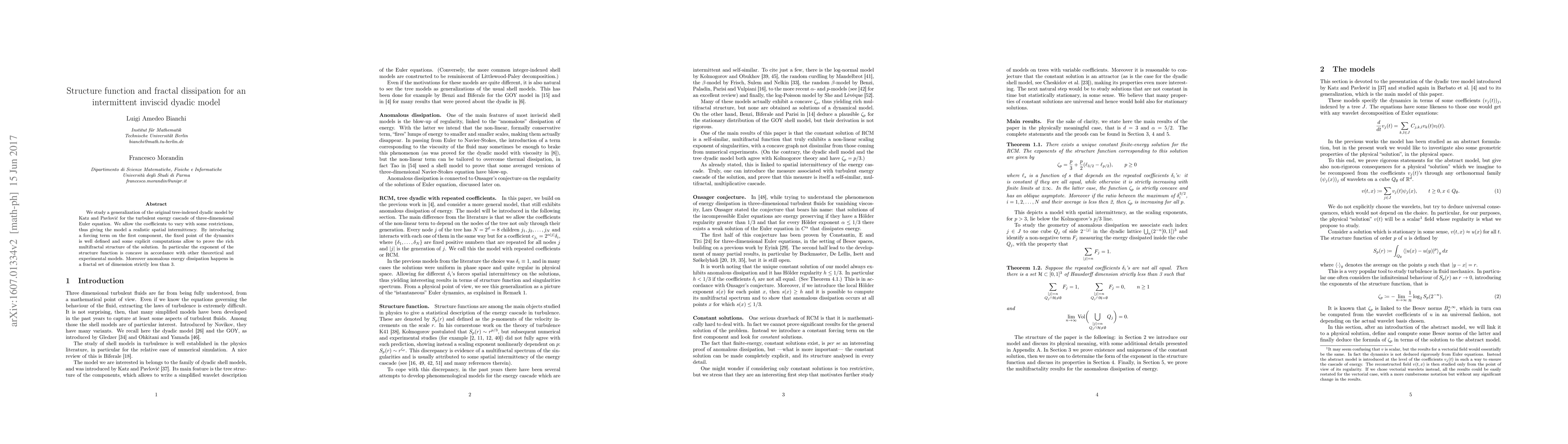 Researchers developed a model to study turbulent energy cascade in 3D Euler equation, finding that it exhibits fractal dissipation with a dimension less than 3, consistent with other models.