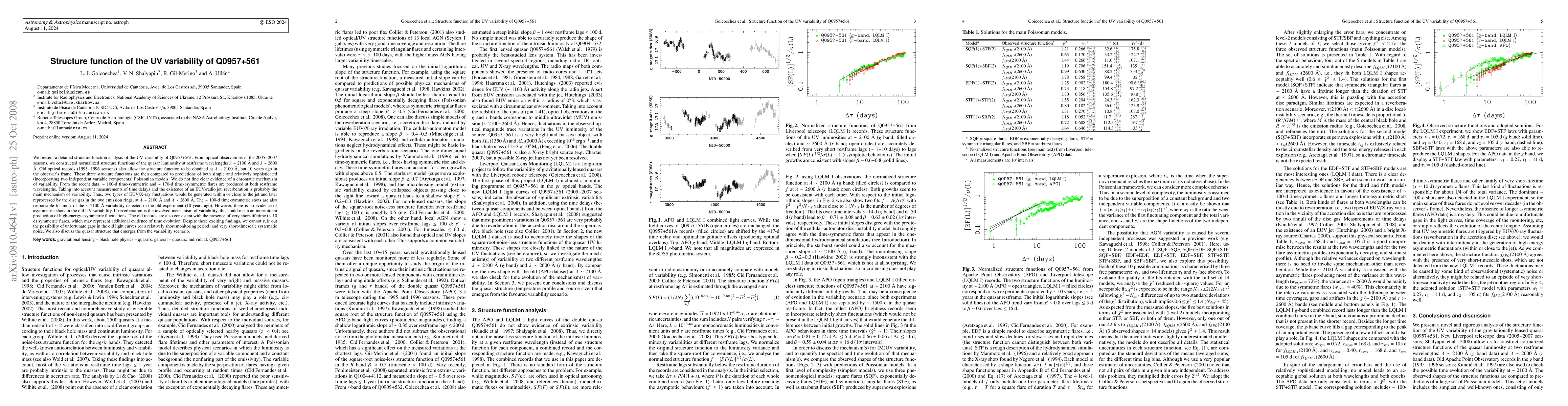 We present a detailed structure function analysis of the UV variability of Q0957+561. From new optical observations, we constructed normalized structure functions of the quasar luminosity at restframe wavelengths of 2100 and 2600 \AA. Old optical records also allow the structure function to be obtained at 2100 \AA, but 10 years ago in the observer's frame. These three structure functions are then compared to predictions of both simple and relatively sophisticated (incorporating two independent variable components) Poissonian models. We do not find clear evidence of a chromatic mechanism of variability. From the recent data, 100-d time-symmetric and 170-d time-asymmetric flares are produced at both restframe wavelengths. Taking into account measurements of time delays and the existence of an EUV/radio jet, reverberation is probably the main mechanism of variability. Thus, two types of EUV/X-ray fluctuations would be generated within or close to the jet and later reprocessed by the disc gas in the two emission rings. The 100-d time-symmetric shots are also responsible for most of the 2100 \AA variability detected in the old experiment. However, there is no evidence of asymmetric shots in the old UV variability. If reverberation is the involved mechanism of variability, this could mean an intermittent production of high-energy asymmetric fluctuations. The old records are also consistent with the presence of very short-lifetime (10 d) symmetric flares, which may represent additional evidence of time evolution. We also discuss the quasar structure that emerges from the variability scenario.