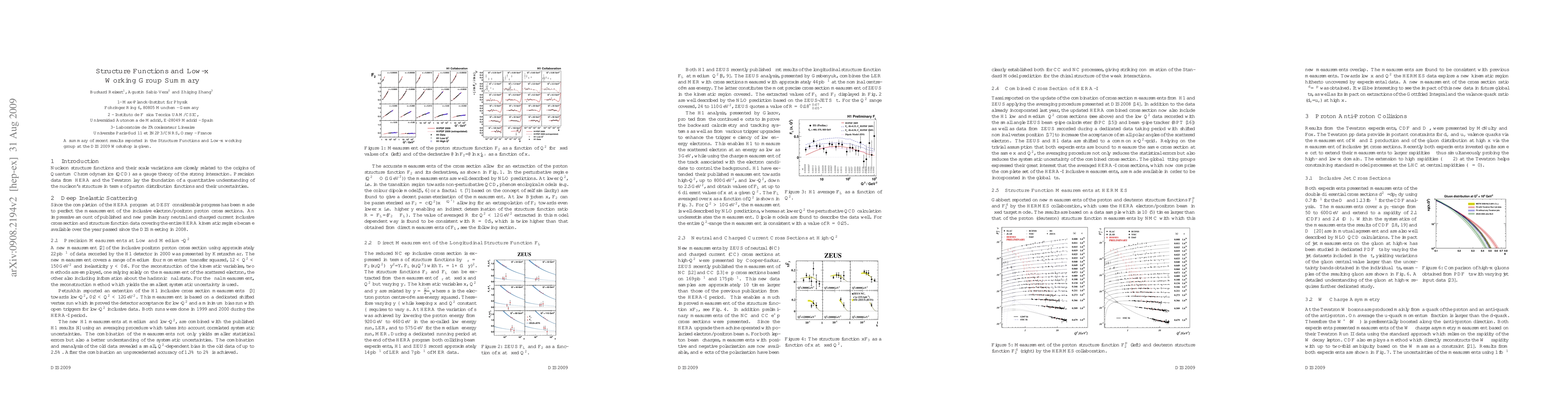 This summary presents recent findings from the Structure Functions and Low-x working group at the DIS 2009 Workshop, including new deep inelastic scattering measurements from HERA and proton-antiproton collisions at Tevatron, alongside advancements in parton distribution function extraction and theoretical developments.