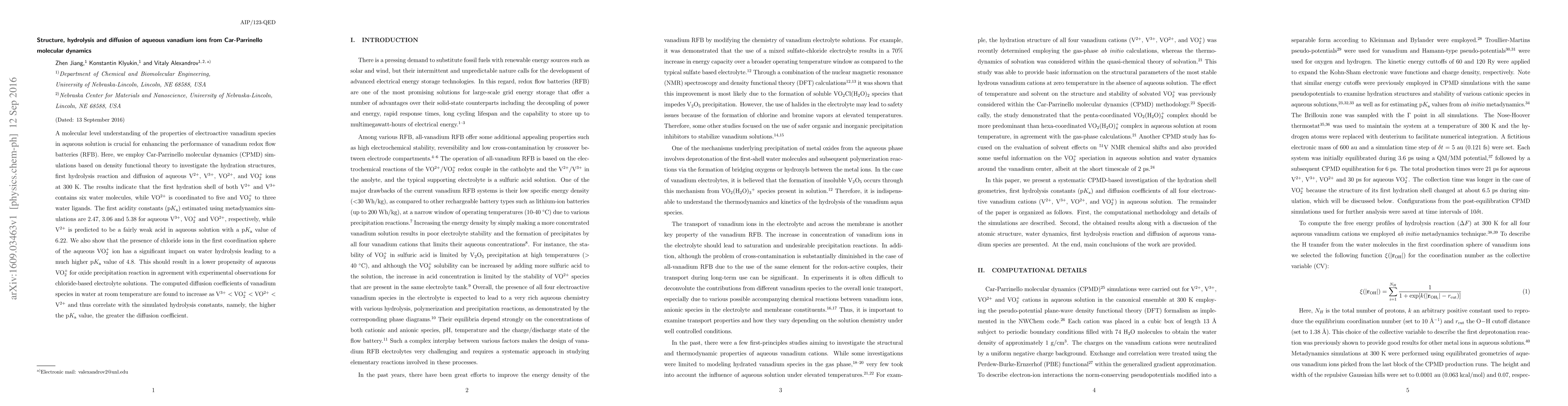 This paper uses Car-Parrinello molecular dynamics simulations to study the hydration structures, hydrolysis reactions, and diffusion of various vanadium ions in aqueous solution, revealing that the first hydration shell varies with ion type and hydrolysis is influenced by chloride ions, which also affects the diffusion coefficients of the ions.