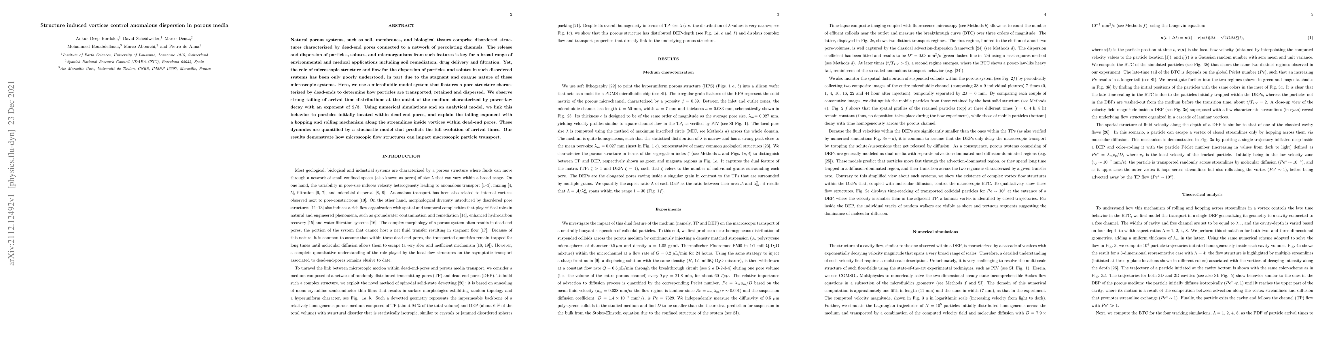 Natural porous systems, such as soil, membranes, and biological tissues comprise disordered structures characterized by dead-end pores connected to a network of percolating channels. The release and dispersion of particles, solutes, and microorganisms from such features is key for a broad range of environmental and medical applications including soil remediation, drug delivery and filtration. Yet, the role of microscopic structure and flow for the dispersion of particles and solutes in such disordered systems has been only poorly understood, in part due to the stagnant and opaque nature of these microscopic systems. Here, we use a microfluidic model system that features a pore structure characterized by dead-ends to determine how particles are transported, retained and dispersed. We observe strong tailing of arrival time distributions at the outlet of the medium characterized by power-law decay with an exponent of 2/3. Using numerical simulations and an analytical model, we link this behavior to particles initially located within dead-end pores, and explain the tailing exponent with a hopping and rolling mechanism along the streamlines inside vortices within dead-end pores. These dynamics are quantified by a stochastic model that predicts the full evolution of arrival times. Our results demonstrate how microscopic flow structures can impact macroscopic particle transport.