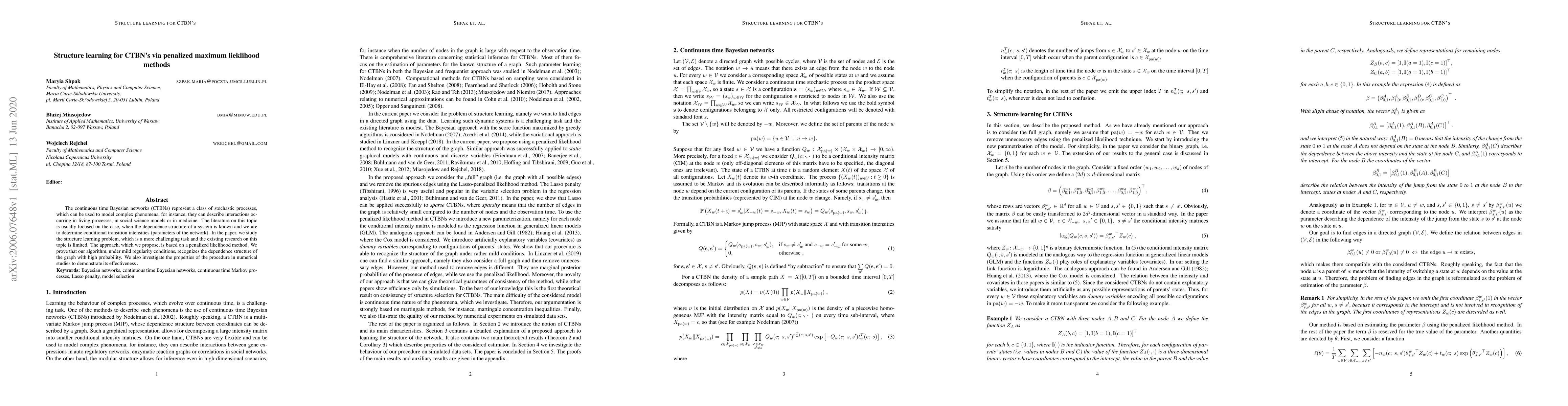 The continuous-time Bayesian networks (CTBNs) represent a class of stochastic processes, which can be used to model complex phenomena, for instance, they can describe interactions occurring in living processes, in social science models or in medicine. The literature on this topic is usually focused on the case when the dependence structure of a system is known and we are to determine conditional transition intensities (parameters of the network). In the paper, we study the structure learning problem, which is a more challenging task and the existing research on this topic is limited. The approach, which we propose, is based on a penalized likelihood method. We prove that our algorithm, under mild regularity conditions, recognizes the dependence structure of the graph with high probability. We also investigate the properties of the procedure in numerical studies to demonstrate its effectiveness.