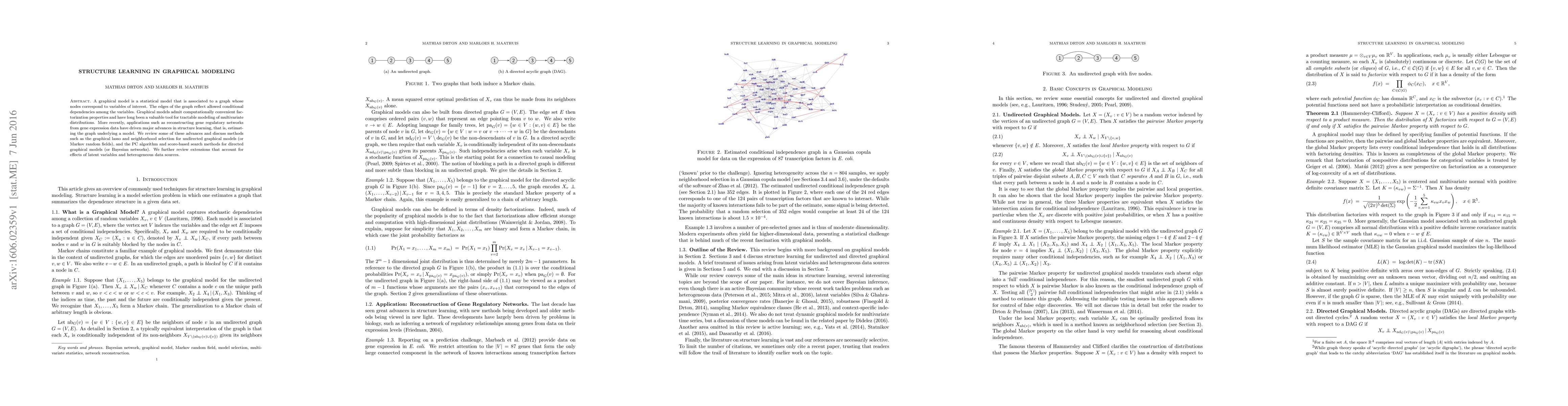 A graphical model is a statistical model that is associated to a graph whose nodes correspond to variables of interest. The edges of the graph reflect allowed conditional dependencies among the variables. Graphical models admit computationally convenient factorization properties and have long been a valuable tool for tractable modeling of multivariate distributions. More recently, applications such as reconstructing gene regulatory networks from gene expression data have driven major advances in structure learning, that is, estimating the graph underlying a model. We review some of these advances and discuss methods such as the graphical lasso and neighborhood selection for undirected graphical models (or Markov random fields), and the PC algorithm and score-based search methods for directed graphical models (or Bayesian networks). We further review extensions that account for effects of latent variables and heterogeneous data sources.