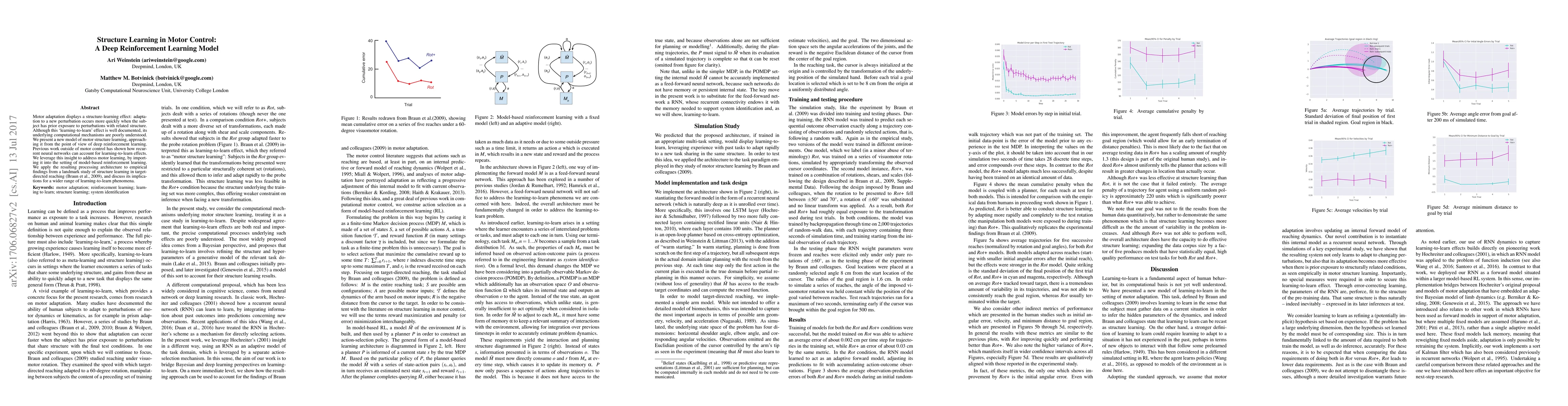 Motor adaptation displays a structure-learning effect: adaptation to a new perturbation occurs more quickly when the subject has prior exposure to perturbations with related structure. Although this `learning-to-learn' effect is well documented, its underlying computational mechanisms are poorly understood. We present a new model of motor structure learning, approaching it from the point of view of deep reinforcement learning. Previous work outside of motor control has shown how recurrent neural networks can account for learning-to-learn effects. We leverage this insight to address motor learning, by importing it into the setting of model-based reinforcement learning. We apply the resulting processing architecture to empirical findings from a landmark study of structure learning in target-directed reaching (Braun et al., 2009), and discuss its implications for a wider range of learning-to-learn phenomena.