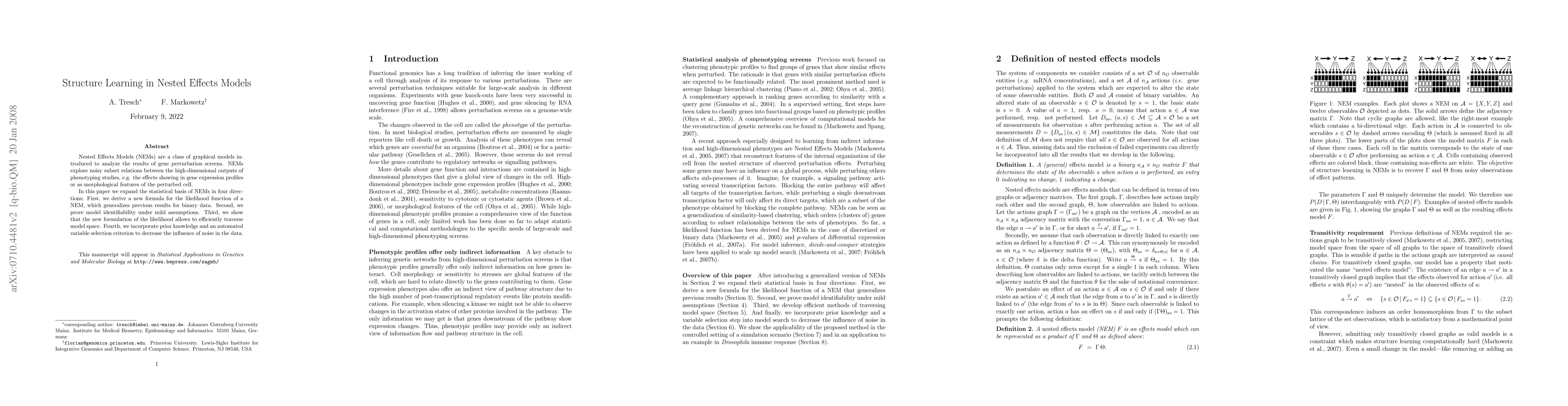 Nested Effects Models (NEMs) are a class of graphical models introduced to analyze the results of gene perturbation screens. NEMs explore noisy subset relations between the high-dimensional outputs of phenotyping studies, e.g. the effects showing in gene expression profiles or as morphological features of the perturbed cell. In this paper we expand the statistical basis of NEMs in four directions: First, we derive a new formula for the likelihood function of a NEM, which generalizes previous results for binary data. Second, we prove model identifiability under mild assumptions. Third, we show that the new formulation of the likelihood allows to efficiently traverse model space. Fourth, we incorporate prior knowledge and an automated variable selection criterion to decrease the influence of noise in the data.