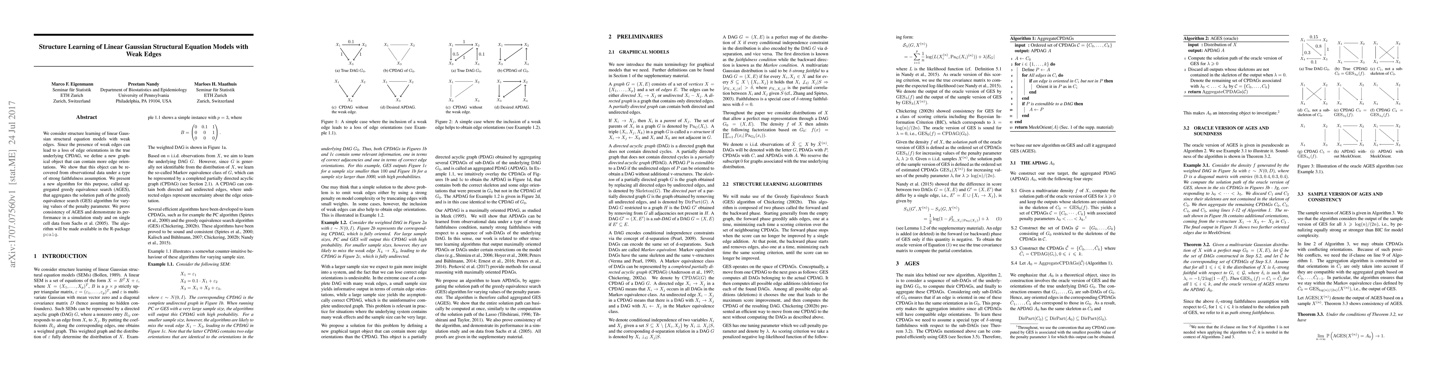 This paper introduces a new algorithm, aggregated greedy equivalence search (AGES), for learning linear Gaussian structural equation models with weak edges. The authors demonstrate that AGES can recover the correct graphical object under a strong faithfulness assumption and show its consistency, performance, and application to both simulated and real single-cell data.