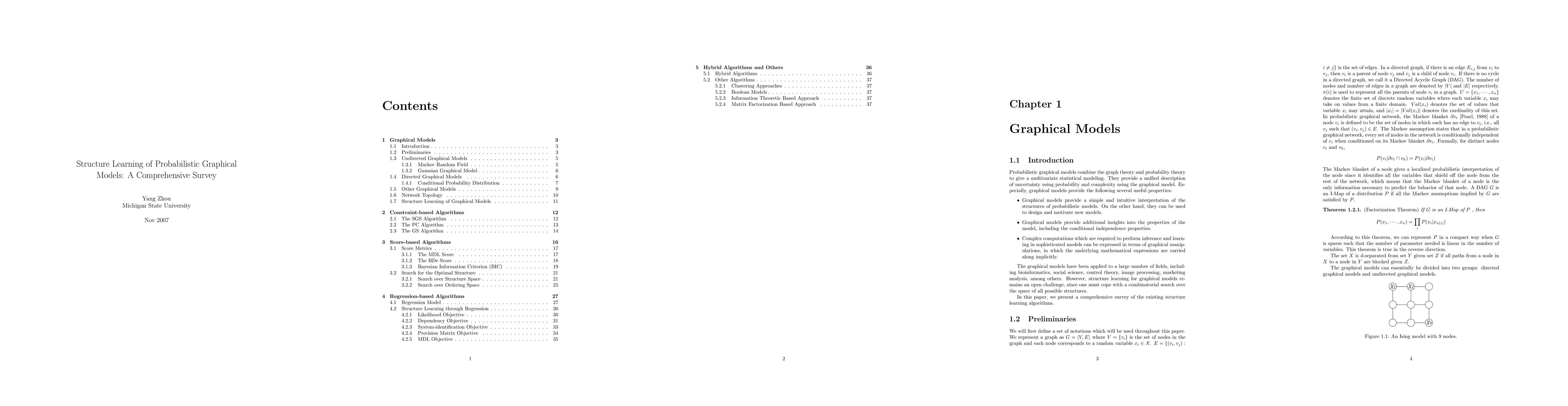 Probabilistic graphical models combine the graph theory and probability theory to give a multivariate statistical modeling. They provide a unified description of uncertainty using probability and complexity using the graphical model. Especially, graphical models provide the following several useful properties: - Graphical models provide a simple and intuitive interpretation of the structures of probabilistic models. On the other hand, they can be used to design and motivate new models. - Graphical models provide additional insights into the properties of the model, including the conditional independence properties. - Complex computations which are required to perform inference and learning in sophisticated models can be expressed in terms of graphical manipulations, in which the underlying mathematical expressions are carried along implicitly. The graphical models have been applied to a large number of fields, including bioinformatics, social science, control theory, image processing, marketing analysis, among others. However, structure learning for graphical models remains an open challenge, since one must cope with a combinatorial search over the space of all possible structures. In this paper, we present a comprehensive survey of the existing structure learning algorithms.