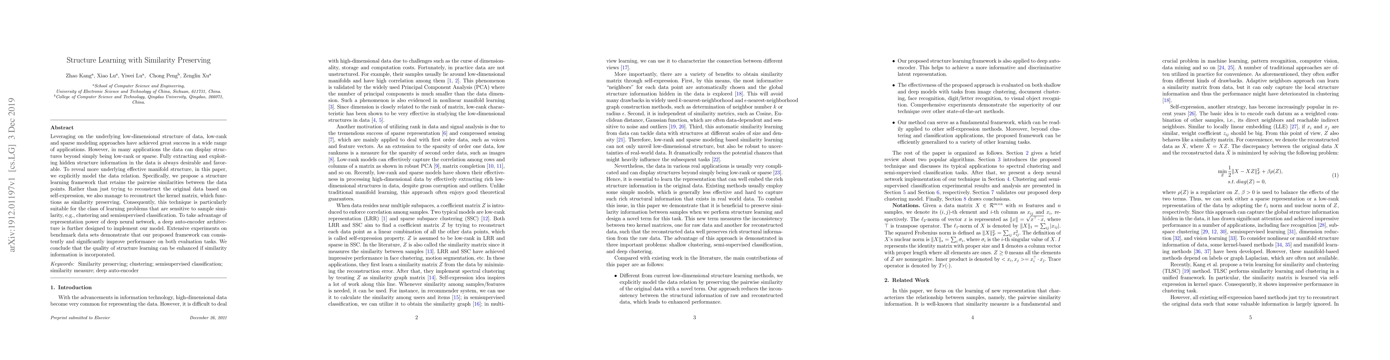 Leveraging on the underlying low-dimensional structure of data, low-rank and sparse modeling approaches have achieved great success in a wide range of applications. However, in many applications the data can display structures beyond simply being low-rank or sparse. Fully extracting and exploiting hidden structure information in the data is always desirable and favorable. To reveal more underlying effective manifold structure, in this paper, we explicitly model the data relation. Specifically, we propose a structure learning framework that retains the pairwise similarities between the data points. Rather than just trying to reconstruct the original data based on self-expression, we also manage to reconstruct the kernel matrix, which functions as similarity preserving. Consequently, this technique is particularly suitable for the class of learning problems that are sensitive to sample similarity, e.g., clustering and semisupervised classification. To take advantage of representation power of deep neural network, a deep auto-encoder architecture is further designed to implement our model. Extensive experiments on benchmark data sets demonstrate that our proposed framework can consistently and significantly improve performance on both evaluation tasks. We conclude that the quality of structure learning can be enhanced if similarity information is incorporated.