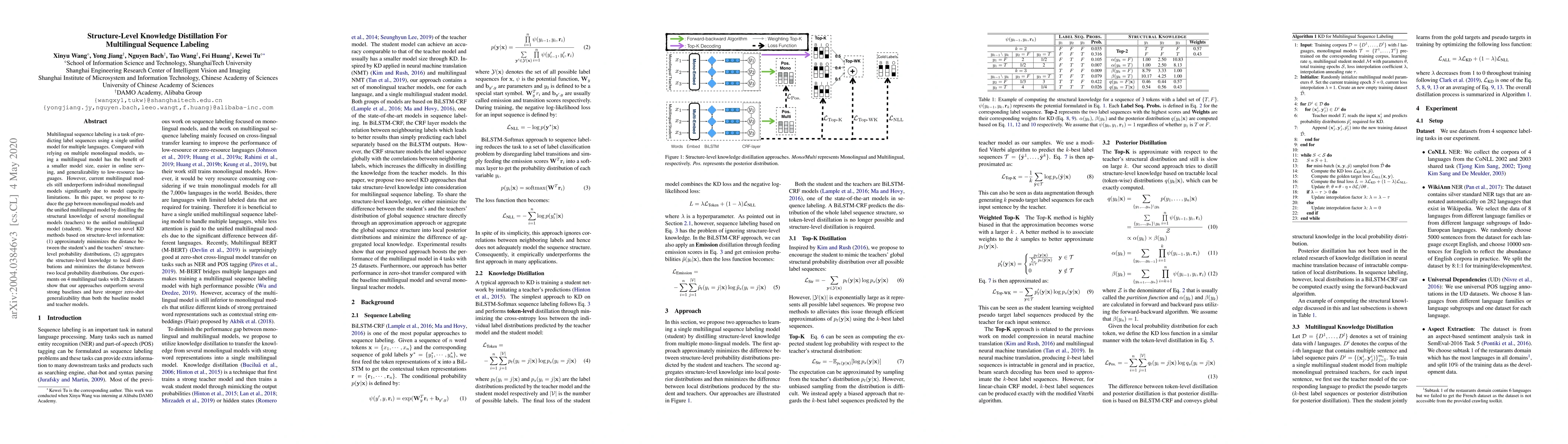 This paper proposes knowledge distillation methods to enhance a multilingual sequence labeling model by transferring structural knowledge from multiple monolingual models. The proposed methods improve the performance gap between monolingual and multilingual models, demonstrating better results and zero-shot generalizability across various multilingual tasks.