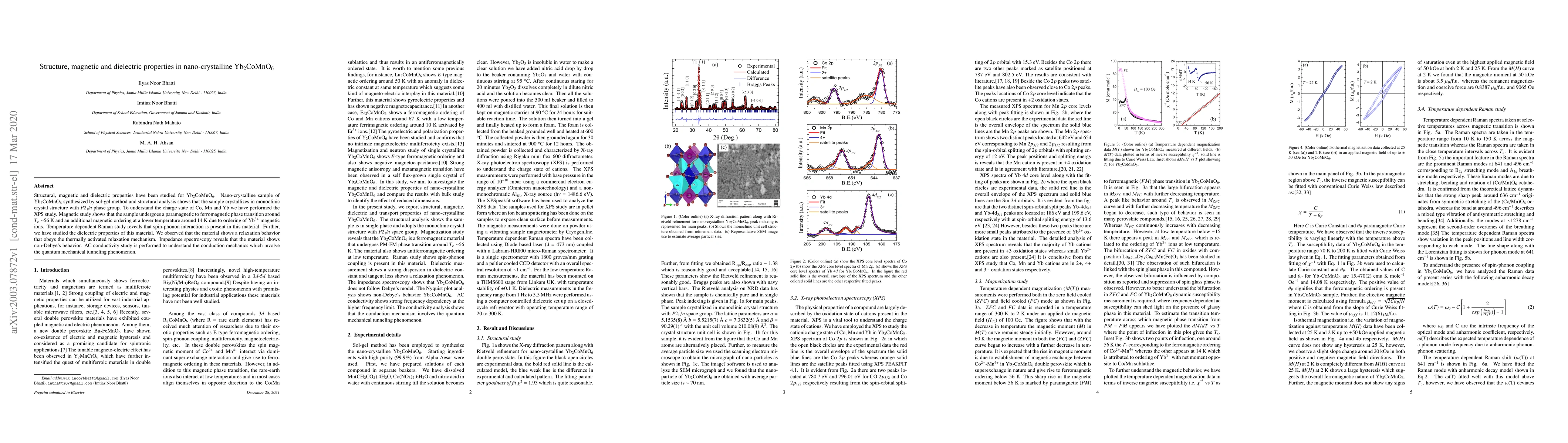 Yb$_2$CoMnO$_6$ nano-crystalline material synthesized via sol-gel method exhibits a monoclinic crystal structure and undergoes a paramagnetic to ferromagnetic transition at 56 K. Its dielectric properties show relaxation behavior and non-Debye's behavior, with AC conductivity indicating quantum mechanical tunneling.