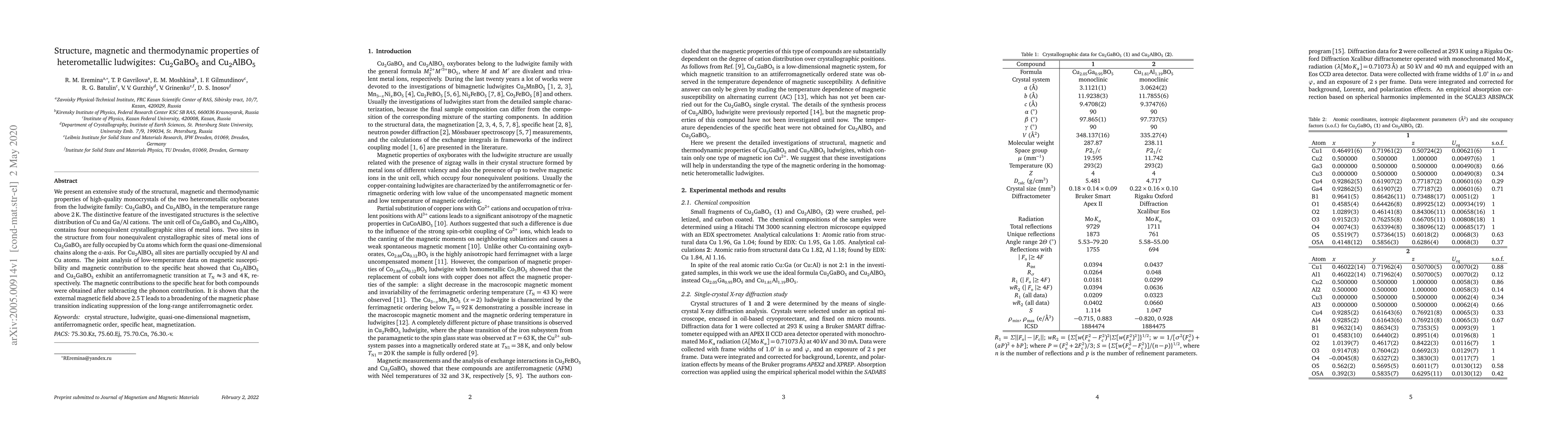 We present an extensive study of the structural, magnetic and thermodynamic properties of high-quality monocrystals of the two heterometallic oxyborates from the ludwigite family: Cu$_2$GaBO$_5$ and Cu$_2$AlBO$_5$ in the temperature range above 2 K. The distinctive feature of the investigated structures is the selective distribution of Cu and Ga/Al cations. The unit cell of Cu$_2$GaBO$_5$ and Cu$_2$AlBO$_5$ contains four nonequivalent crystallographic sites of metal ions. Two sites in the structure from four nonequivalent crystallographic sites of metal ions of Cu$_2$GaBO$_5$ are fully occupied by Cu atoms which form the quasi one-dimensional chains along the a-axis. For Cu$_2$AlBO$_5$ all sites are partially occupied by Al and Cu atoms. The joint analysis of low-temperature data on magnetic susceptibility and magnetic contribution to the specific heat showed that Cu$_2$AlBO$_5$ and Cu$_2$GaBO$_5$ exhibit an antiferromagnetic transition at $T_{\rm N} \approx 3$ and 4 K, respectively. The magnetic contributions to the specific heat for both compounds were obtained after subtracting the phonon contribution. It is shown that the external magnetic field above 2.5 T leads to a broadening of the magnetic phase transition indicating suppression of the long-range antiferromagnetic order.