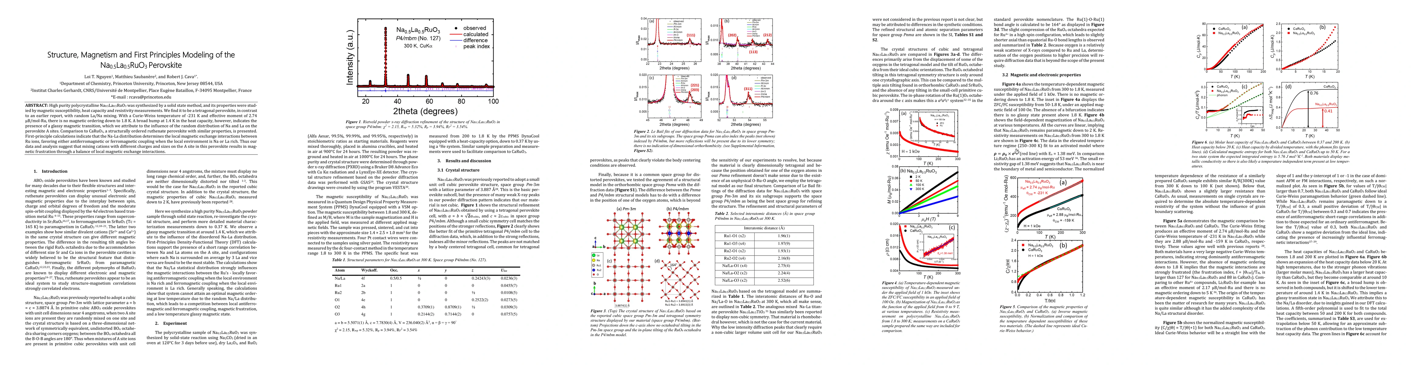 High purity polycrystalline Na0.5La0.5RuO3 was synthesized by a solid state method, and its properties were studied by magnetic susceptibility, heat capacity and resistivity measurements. We find it to be a tetragonal perovskite, in contrast to an earlier report, with random La/Na mixing. With a Curie-Weiss temperature of -231 K and effective moment of 2.74 uB/mol-Ru, there is no magnetic ordering down to 1.8 K. A broad hump at 1.4 K in the heat capacity, however, indicates the presence of a glassy magnetic transition, which we attribute to the influence of the random distribution of Na and La on the perovskite A sites. Comparison to CaRuO3, a structurally ordered ruthenate perovskite with similar properties, is presented. First-principle calculations indicate that the Na-La distribution determines the local magnetic exchange inter-actions between Ru ions, favoring either antiferromagnetic or ferromagnetic coupling when the local environment is Na or La rich. Thus our data and analysis suggest that mixing cations with different charges and sizes on the A site in this perovskite results in magnetic frustration through a balance of local magnetic exchange interactions.