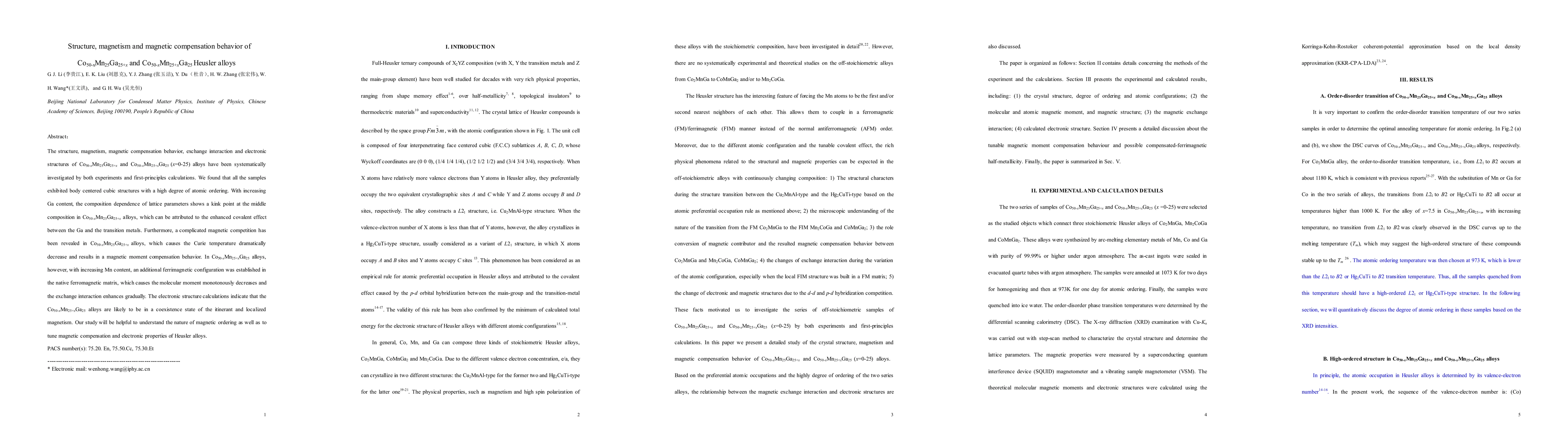The structure, magnetism, magnetic compensation behavior, exchange interaction and electronic structures of Co50-xMn25Ga25+x and Co50-xMn25+xGa25 (x=0-25) alloys have been systematically investigated by both experiments and first-principles calculations. We found that all the samples exhibited body centered cubic structures with a high degree of atomic ordering. With increasing Ga content, the composition dependence of lattice parameters shows a kink point at the middle composition in Co50-xMn25Ga25+x alloys, which can be attributed to the enhanced covalent effect between the Ga and the transition metals. Furthermore, a complicated magnetic competition has been revealed in Co50-xMn25Ga25+x alloys, which causes the Curie temperature dramatically decrease and results in a magnetic moment compensation behavior. In Co50-xMn25+xGa25 alloys, however, with increasing Mn content, an additional ferrimagnetic configuration was established in the native ferromagnetic matrix, which causes the molecular moment monotonously decreases and the exchange interaction enhances gradually. The electronic structure calculations indicate that the Co50-xMn25+xGa25 alloys are likely to be in a coexistence state of the itinerant and localized magnetism. Our study will be helpful to understand the nature of magnetic ordering as well as to tune magnetic compensation and electronic properties of Heusler alloys.