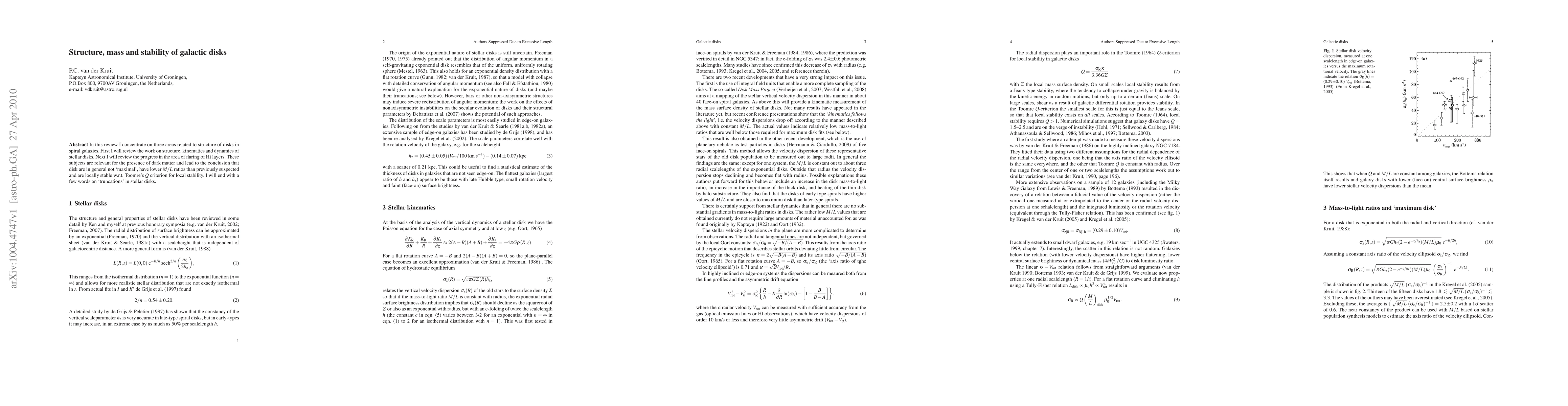 This paper reviews the structure, kinematics, and dynamics of stellar disks in spiral galaxies, noting that disks are not maximal, have lower mass-to-light ratios than previously thought, and are locally stable according to Toomre's Q criterion. It also discusses the flaring of HI layers and truncations in stellar disks.