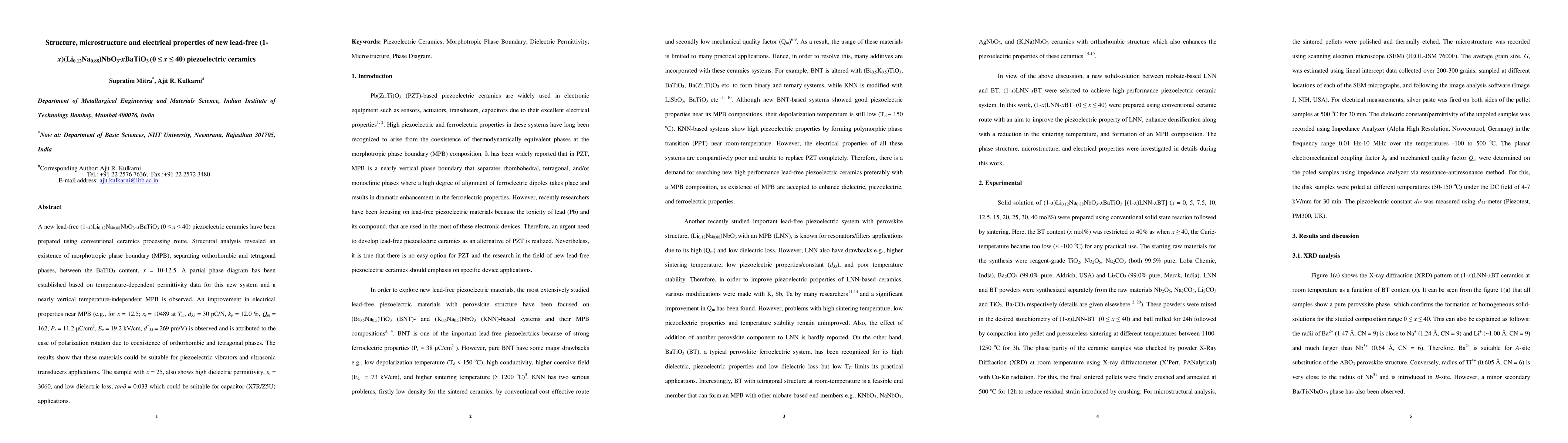 A new lead-free (1-x)Li0.12Na0.88NbO3-xBaTiO3 (0 to x to 40) piezoelectric ceramics have been prepared using conventional ceramics processing route. Structural analysis revealed an existence of morphotropic phase boundary (MPB), separating orthorhombic and tetragonal phases, between the BaTiO3 content, x = 10-12.5. A partial phase diagram has been established based on temperature-dependent permittivity data for this new system and a nearly vertical temperature-independent MPB is observed. An improvement in electrical properties near MPB (e.g., for x = 12.5; {\epsilon}r = 10489 at Tm, d33 = 30 pC/N, kp = 12.0 %, Qm = 162, Pr = 11.2 {\mu}C/cm2, Ec = 19.2 kV/cm, d*33 = 269 pm/V) is observed and is attributed to the ease of polarization rotation due to coexistence of orthorhombic and tetragonal phases. The results show that these materials could be suitable for piezoelectric vibrators and ultrasonic transducers applications. The sample with x = 25, also shows high dielectric permittivity, {\epsilon}r = 3060, and low dielectric loss, tan{\delta} = 0.033 which could be suitable for capacitor (X7R/Z5U) applications.