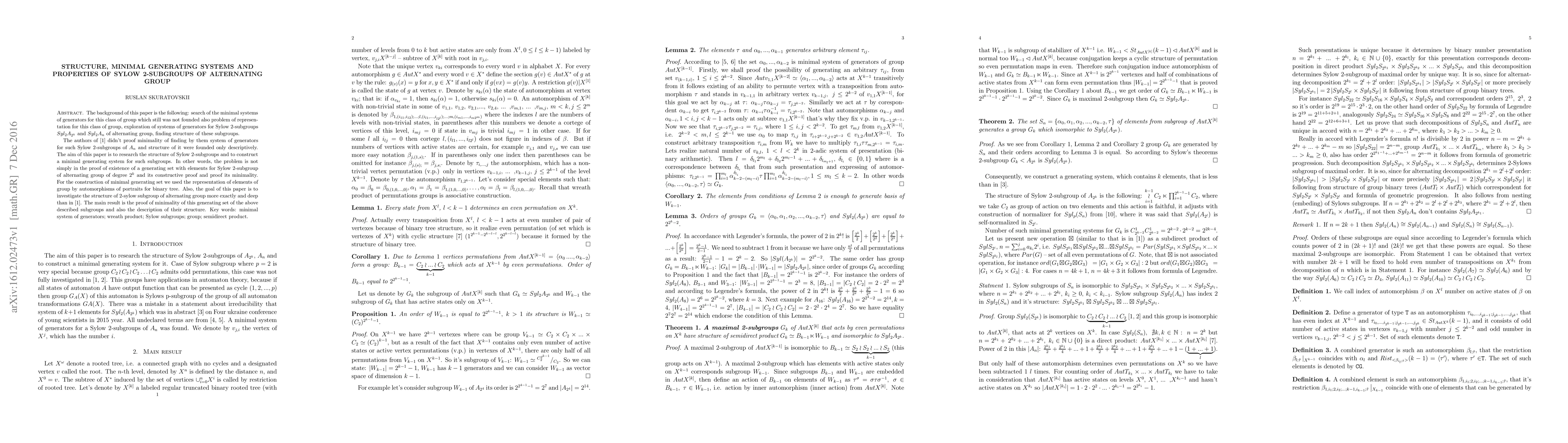 This paper investigates the structure and minimal generating systems of Sylow 2-subgroups in alternating groups, proving the minimality of a newly constructed generating set and providing a detailed description of their structure, contrasting with previous descriptive findings. Keywords: minimal system of generators, wreath product, Sylow subgroups, group, semidirect product.