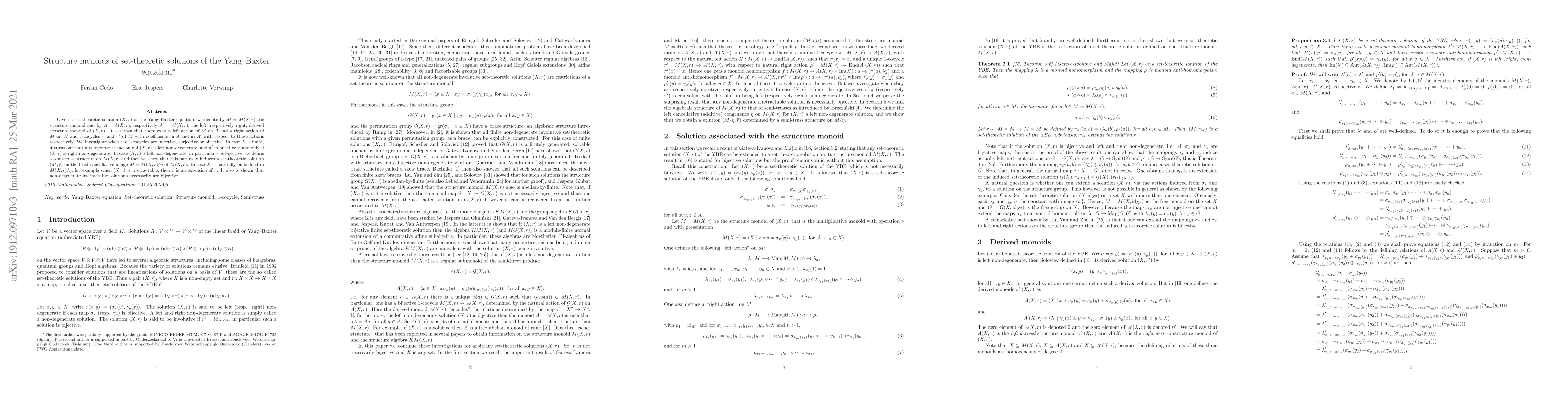 Given a set-theoretic solution $(X,r)$ of the Yang--Baxter equation, we denote by $M=M(X,r)$ the structure monoid and by $A=A(X,r)$, respectively $A'=A'(X,r)$, the left, respectively right, derived structure monoid of $(X,r)$. It is shown that there exist a left action of $M$ on $A$ and a right action of $M$ on $A'$ and 1-cocycles $\pi$ and $\pi'$ of $M$ with coefficients in $A$ and in $A'$ with respect to these actions respectively. We investigate when the 1-cocycles are injective, surjective or bijective. In case $X$ is finite, it turns out that $\pi$ is bijective if and only if $(X,r)$ is left non-degenerate, and $\pi'$ is bijective if and only if $(X,r)$ is right non-degenerate. In case $(X,r) $ is left non-degenerate, in particular $\pi$ is bijective, we define a semi-truss structure on $M(X,r)$ and then we show that this naturally induces a set-theoretic solution $(\bar M, \bar r)$ on the least cancellative image $\bar M= M(X,r)/\eta$ of $M(X,r)$. In case $X$ is naturally embedded in $M(X,r)/\eta$, for example when $(X,r)$ is irretractable, then $\bar r$ is an extension of $r$. It also is shown that non-degenerate irretractable solutions necessarily are bijective.