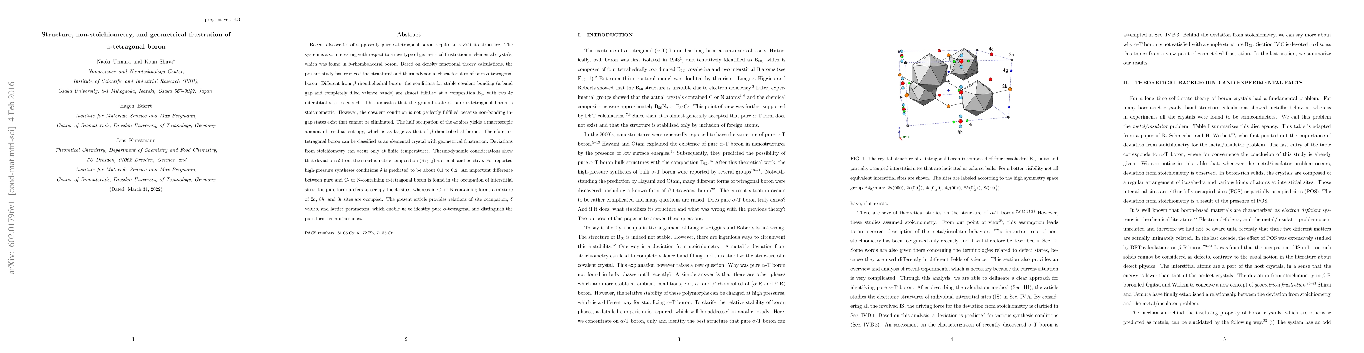 This paper revisits the structure of alpha-tetragonal boron, revealing that its ground state is stoichiometric at B_52, but with non-bonding in-gap states causing geometrical frustration. The study identifies pure alpha-tetragonal boron by its occupation of 4c interstitial sites, distinguishing it from forms containing C or N.