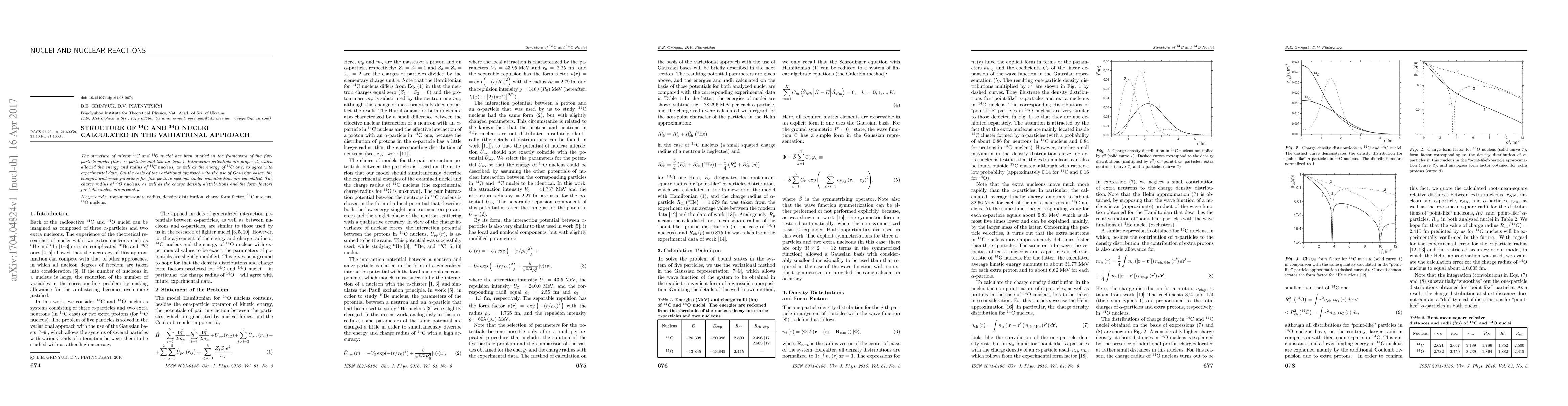 The structure of mirror $^{14}$C and $^{14}$O nuclei has been studied in the framework of the five-particle model (three $\alpha$-particles and two nucleons). Interaction potentials are proposed, which allowed the energy and radius of $^{14}$C nucleus, as well as the energy of $^{14}$O one, to agree with experimental data. On the basis of the variational approach with the use of Gaussian bases, the energies and wave functions for five-particle systems under consideration are calculated. The charge radius of $^{14}$O nucleus, as well as the charge density distributions and the form factors for both nuclei, are predicted.